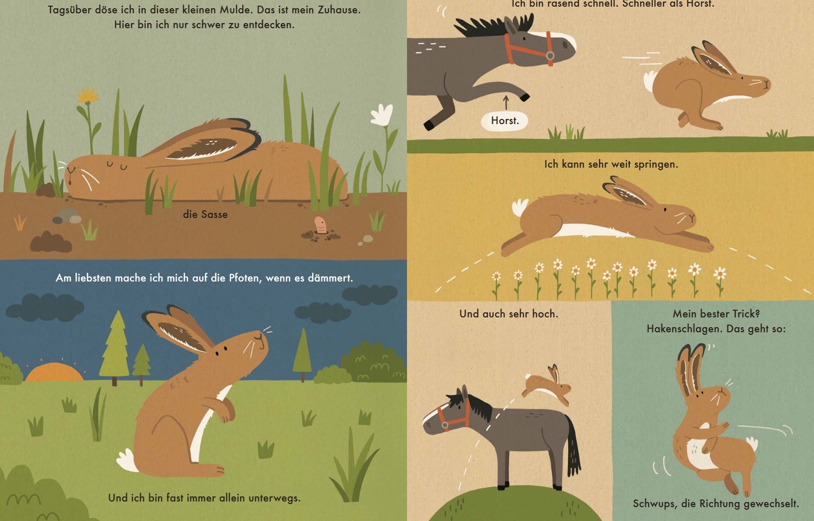 Auf der Hasenhochzeit – die Partnersuche – treffe ich andere Hasen, um Häsinnen zu beeindrucken. Dann zeigen wir, wer am schnellsten laufen, am weitesten springen und am besten boxen kann. Drei- bis viermal im Jahr kommen Junge zur Welt. Sie bleiben nur ein paar Wochen in der Nähe, dann hoppeln sie allein weiter. Wir sind fast immer allein unterwegs.