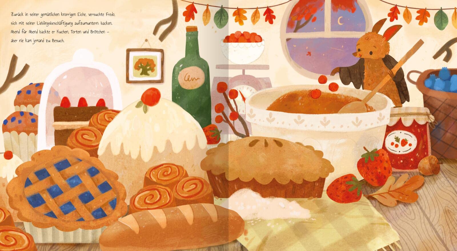 „Ich bin doch gar nicht gruselig!“: Tief in einem dunklen Teil des Waldes lebt in einer knorrigen alten Eiche die kleine Fledermaus Fredo. Am liebsten backt er Abend für Abend Kuchen, Torten und Brötchen. Doch Besuch bekommt er keinen, denn die anderen Tiere haben Angst vor ihm. Auf der Suche nach Wintervorräten landet Bärenmädchen Betty vor der Eiche und wird von einem köstlichen Duft angezogen…