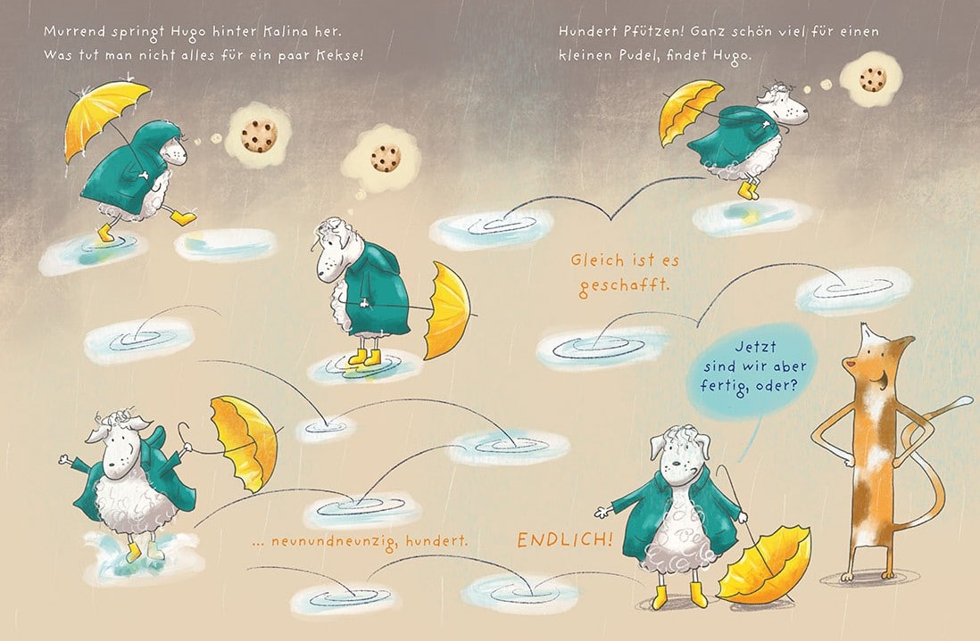 Ich liebe Regentage, was man da alles machen kann – Kalina schaut ganz verträumt aus dem Fenster, an das die Regentropfen prasseln. Doof, brummt Hugo. Der mag keinen Regen und hat es sich im Sessel mit einem Buch bequem gemacht. Dazu würden jetzt wunderbar Schokoladenkekse passen. Leider gehören die, die auf dem Tisch liegen nicht ihm. Kalina will raus. Und Hugo soll mitkommen. Aber der mag partout nicht.