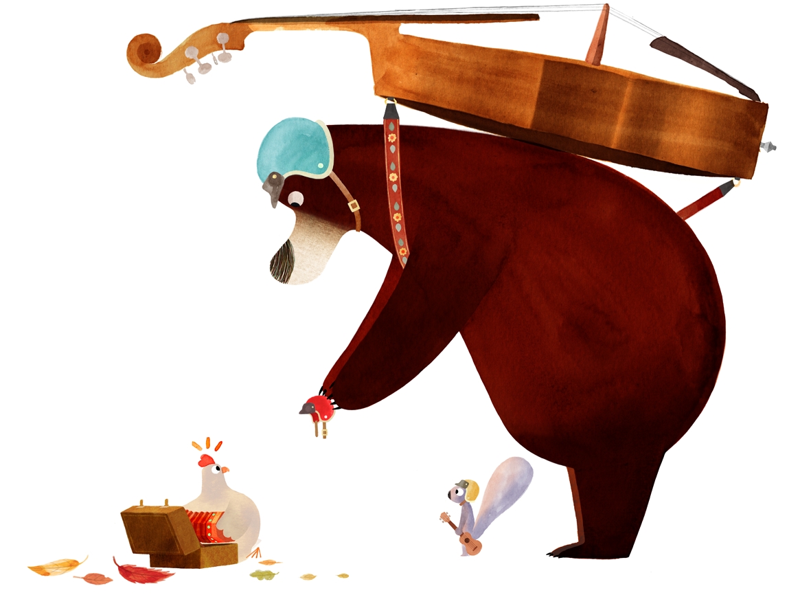 Wohin Bär und Hörnchen auch gehen, sie gehören zusammen. Sie singen, tanzen und spielen gemeinsam. Bär und Hörnchen stimmen in allem perfekt überein. Eines Tages taucht Huhn auf und will gern mit den beiden etwas machen. Es macht keinen Spaß, so allein zu spielen. Bär und Hörnchen sagen jedoch, nein. Zu dritt? Da haben sie keinen Bedarf. Doch Huhn lässt nicht locker. Immer wieder taucht es auf.