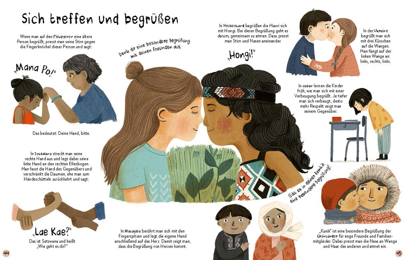 Abwechslungsreich mit sechs Doppelseiten aufgelockert, auf denen verschiedene Worte wie „Hallo“, „Bitte“, „Danke“ oder Redewendungen wie „Gute Nacht!“ in den unterschiedlichsten Sprachen vorgestellt werden und übersetzt sind. Ein zusätzlicher Coup sind die Illustrationen von Andrea Stegmaier. Passend harmonisch in erdig-gedeckten Farben gehalten. Reich an Details. Wunderbar abbildend. Ganz natürlich magisch in den Bann ziehend. Daebak!