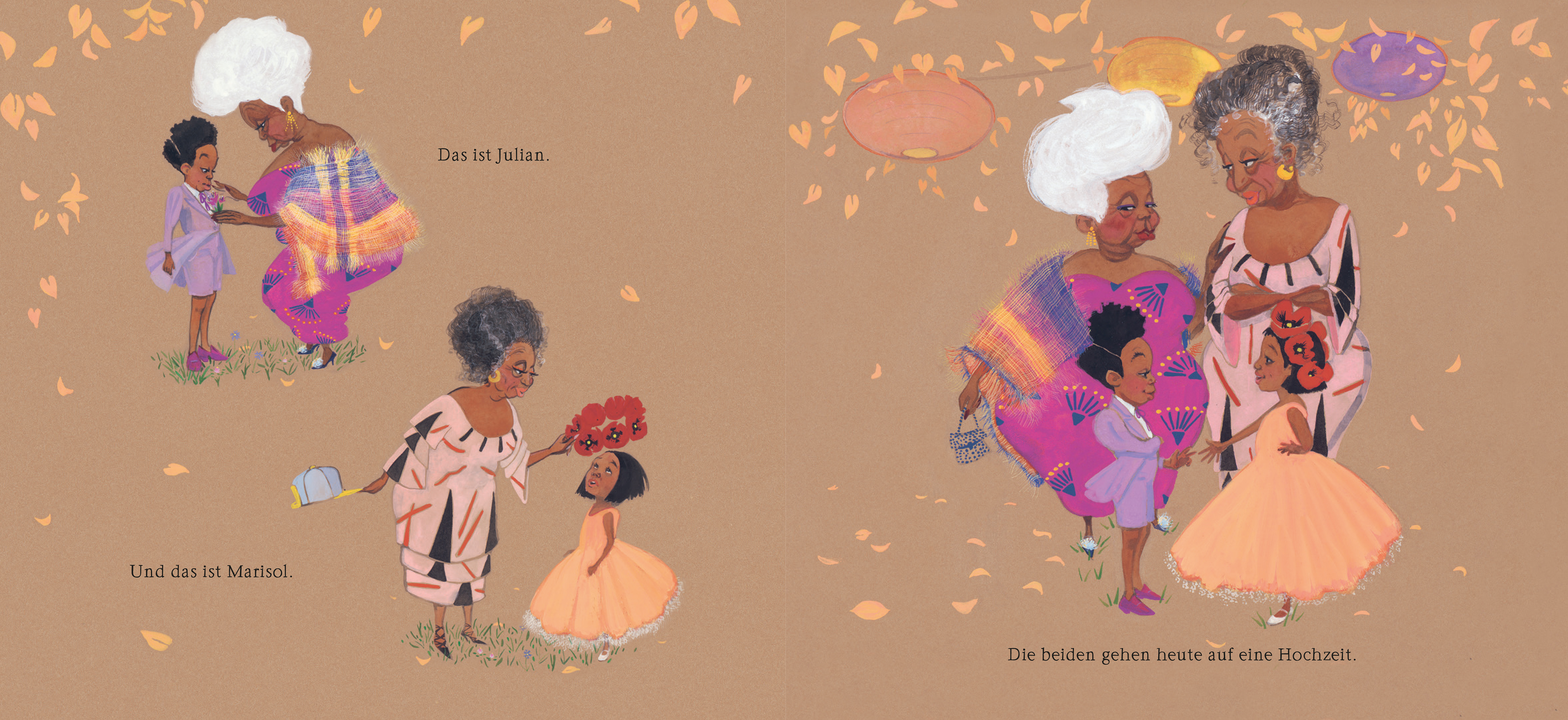 Julian und seine Großmutter machen sich schick. Marisol und ihre Oma ebenfalls. Sie sind auf eine Hochzeit eingeladen. Julian und Marisol sind die Blumenkinder der beiden Bräute. Zusammen mit deren Hund Gloria streuen sie kunterbunte Blütenblätter. Wie wunderschön und glücklich das Hochzeitspaar aussieht. Andächtig lauschen Julian und Marisol der Zeremonie. Nach dem Kuss setzen sich alle an eine festlich gedeckte Tafel.