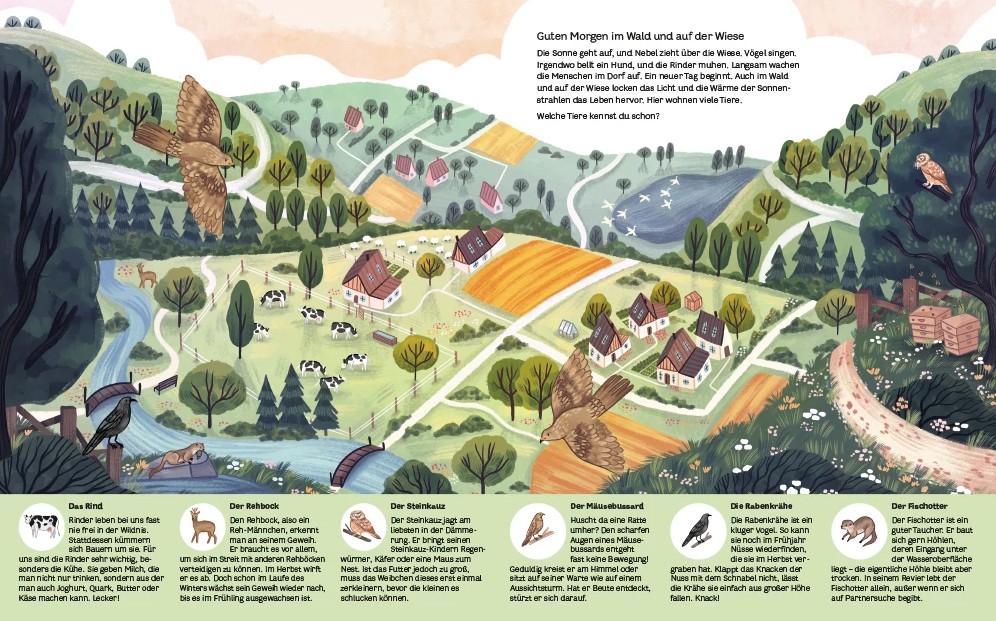 Die Sonne geht auf und ein neuer Tag beginnt. Im Wald und auf der Wiese locken das Licht und die Wärme der Sonnenstrahlen das Leben hervor. In den frühen Morgenstunden suchen viele Tiere nach Futter. Auf der Wiese wachsen neben Gras auch Blumen und Kräuter. Blumen haben süßen Nektar und Blütenstaub. Bienen, Hummeln, Schmetterlinge, Käfer und andere Insekten ernähren sich davon. Im Geäst von Büschen und Sträuchern am Waldrand flattern viele Vögel umher.