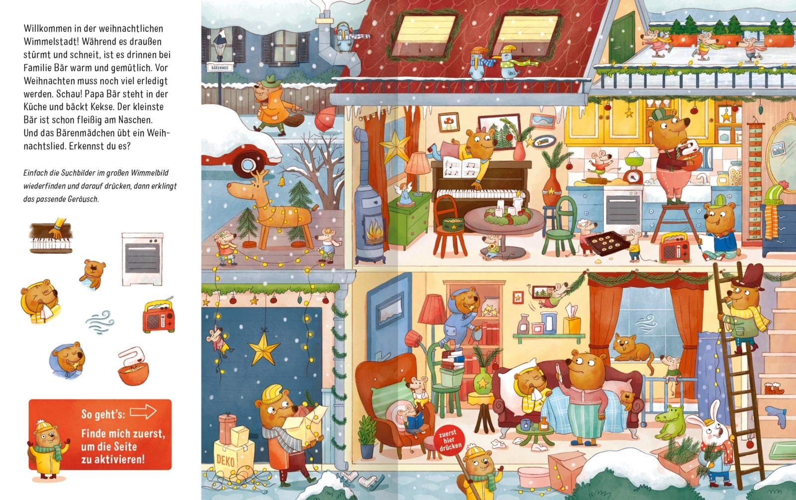 In „Klingeling, wo ist das Glöckchen?: Mein Weihnachts-Such-Soundbuch“* versteckt sich Wimmelspaß zum Suchen und Hören mit 45 lustigen und weihnachtlichen Geräuschen sowie charmant-stimmungsvollen Illustrationen von Pina Gertenbach. Zuerst muss die ausgewählte Seite aktiviert und dann die einzelnen Suchbilder im großen Wimmelbild gefunden werden. Drückt man auf die entsprechende Szene, erklingt dazu das passende Geräusch. Die verschiedensten Situationen wie ein Besuch auf dem Weihnachtsmarkt, Heiligabend bei Familie Maus oder ein Ausflug in die Berge laden zum Staunen, Betrachten und Entdecken ein.