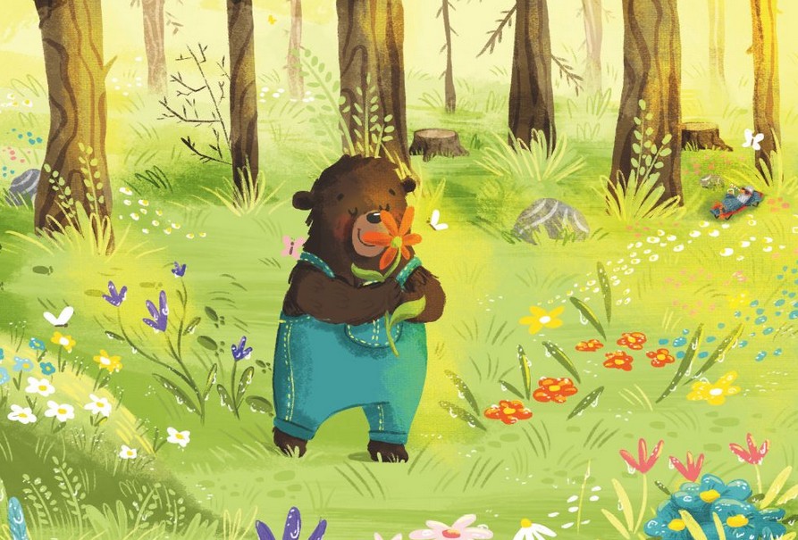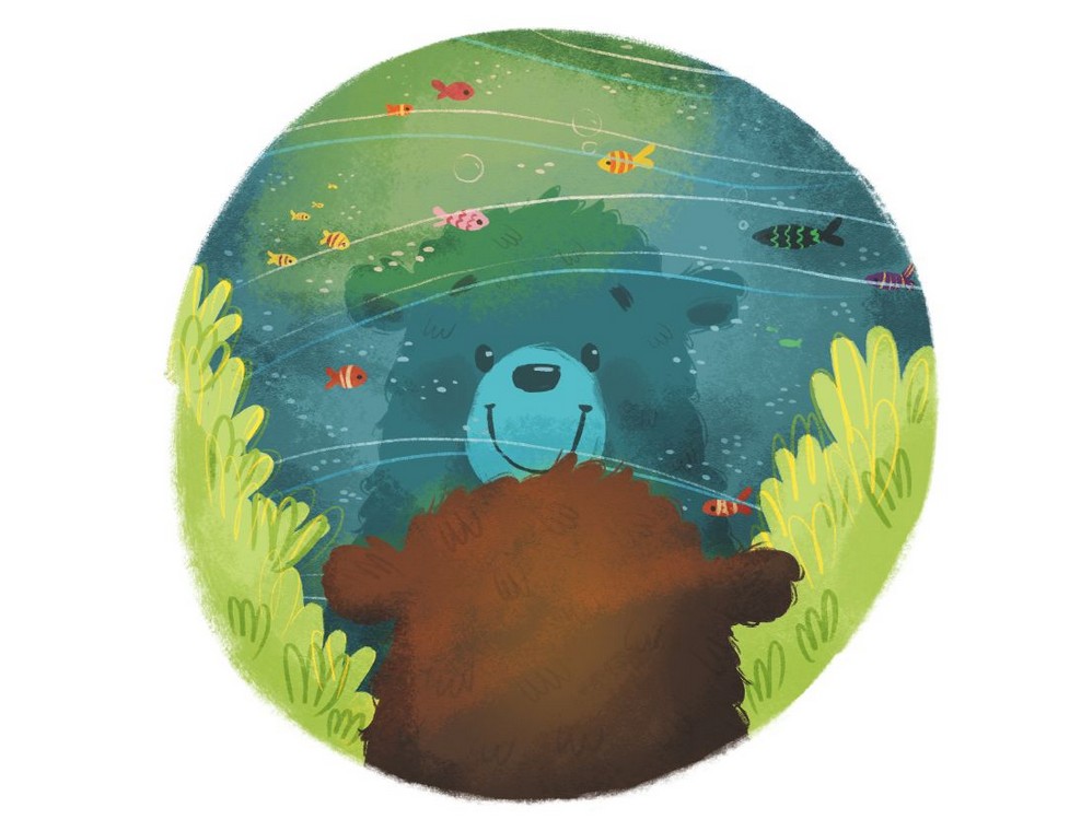 Bär ist aus dem Winterschlaf erwacht. Voller Tatendrang schnuppert er an den Frühlingsblumen, lauscht dem Flüstern der Blätter und beobachtet vergnügt die schillernden Fische im Wasser des kleinen Teiches. Aber was ist das? Vorsichtig beugt er sich vor und betrachtet prüfend sein Spiegelbild. Von einem Ohr bis zum anderen ist da ein Lächeln in seinem Gesicht. Wem das wohl gehört?