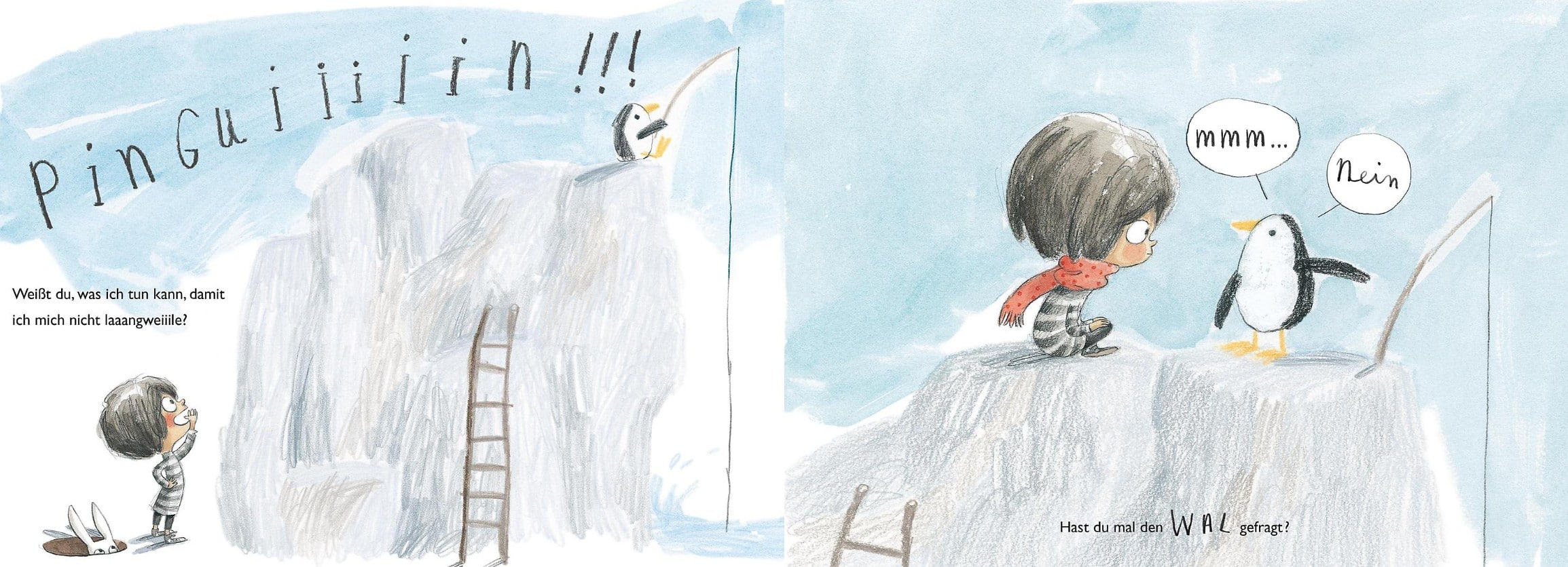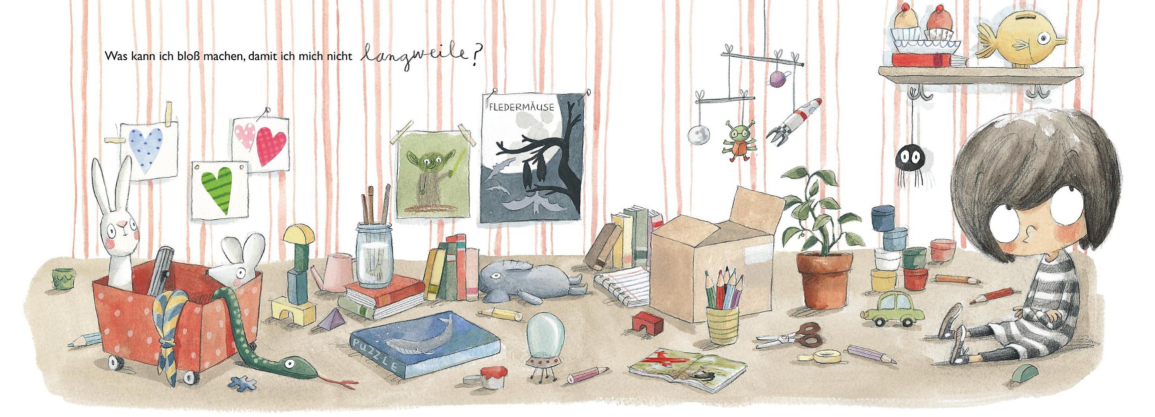 Und Langweile ist doof. Was man wohl dagegen machen kann? Vielleicht weiß ja die Maus hinter der roten Tür einen Rat? Aber die hat keine Ahnung. Auch nicht das Kaninchen, die Fledermaus, die Spinne, die Schlange, der Pinguin oder der Wal. Keiner weiß was. Dann vielleicht der Außerirdische? Der hat eine Idee. Eine richtig gute Idee…