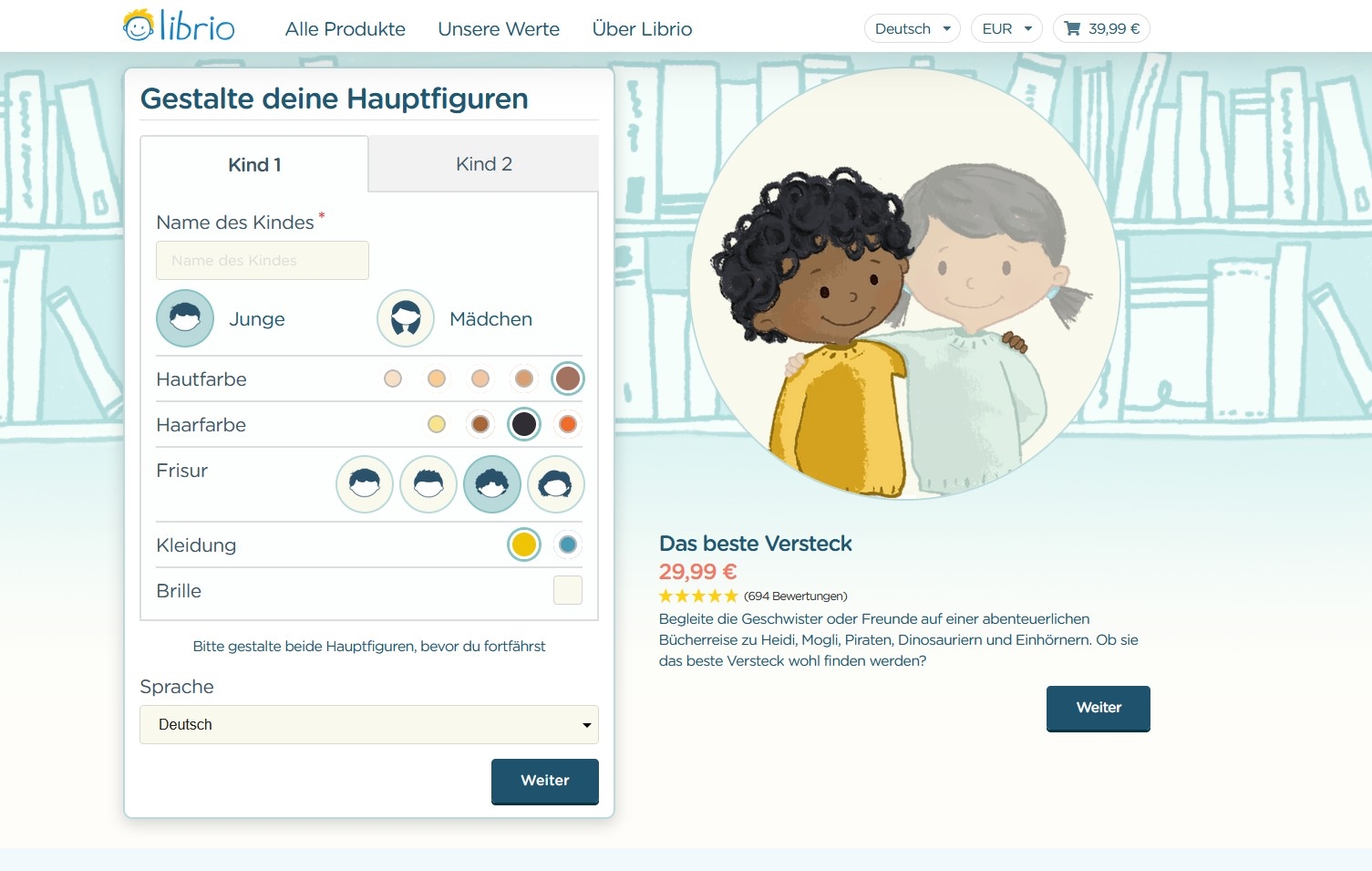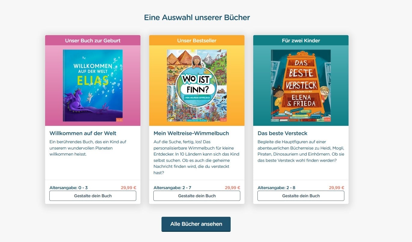 Schritt 1: Das gewünschte Buch auswählen. Schritt 2: Das Buch gestalten – Namen, Aussehen und Sprache der Hauptfigur/en werden ganz individuell bestimmt. (Die einzelnen Schritte können dann in der Vorschau des erstellten Buches überprüft werden.) Bei allen Geschichten gibt es noch zusätzlich die Möglichkeit, eine persönliche, inspirierende oder lustige Nachricht zu verfassen. Schritt 3: Das fertige Produkt in den Warenkorb legen und die gewünschte Zahlungsmethode aussuchen.