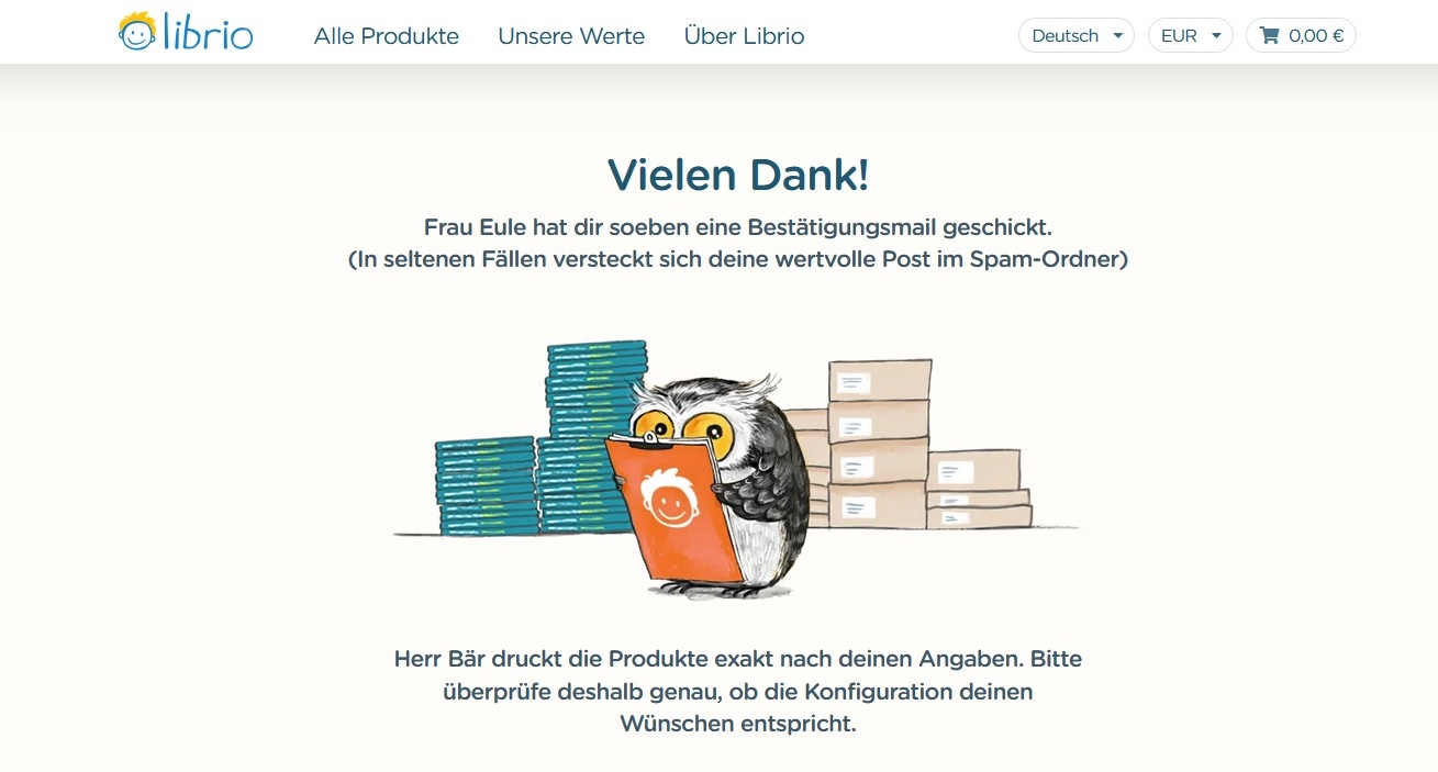 Allein schon das Bestellen bei Librio ist ein Rundumerlebnis. So hilft Frau Eule zum Beispiel bei der Suche nach dem passenden Buch oder Geschenk und kümmert sich um alle Kundenangelegenheiten. Und Herr Bär ist für den Druck, die Logistik und den Versand zuständig. Bei Librio übernehmen die verschiedensten Waldtiere alle wichtigen Arbeitsschritte, die nötig sind, um ein Buch bis zur entsprechenden Adresse zu liefern. Das vermittelt schon für den Schenkenden beziehungsweise Bestellenden das Gefühl Teil einer Geschichte zu sein.