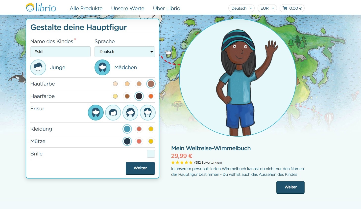 Das „Wo ist…? – Mein Weltreise-Wimmelbuch“* ist für Kinder zwischen 2 und 7 Jahren geeignet und in 10 Sprachen erhältlich: Deutsch, Englisch, Spanisch, Französisch, Italienisch, Türkisch, Albanisch, Portugiesisch und Katalanisch. Neben Namen und Geschlecht können die Hautfarbe, Haarfarbe sowie die Kleidung angepasst werden. Insgesamt sind über 750 verschiedene Kombinationen möglich.