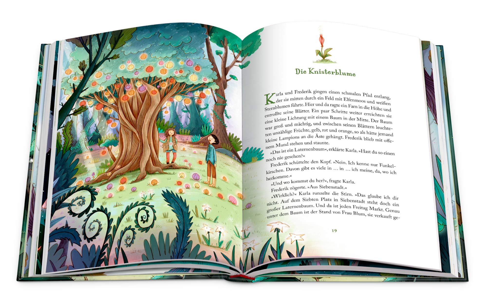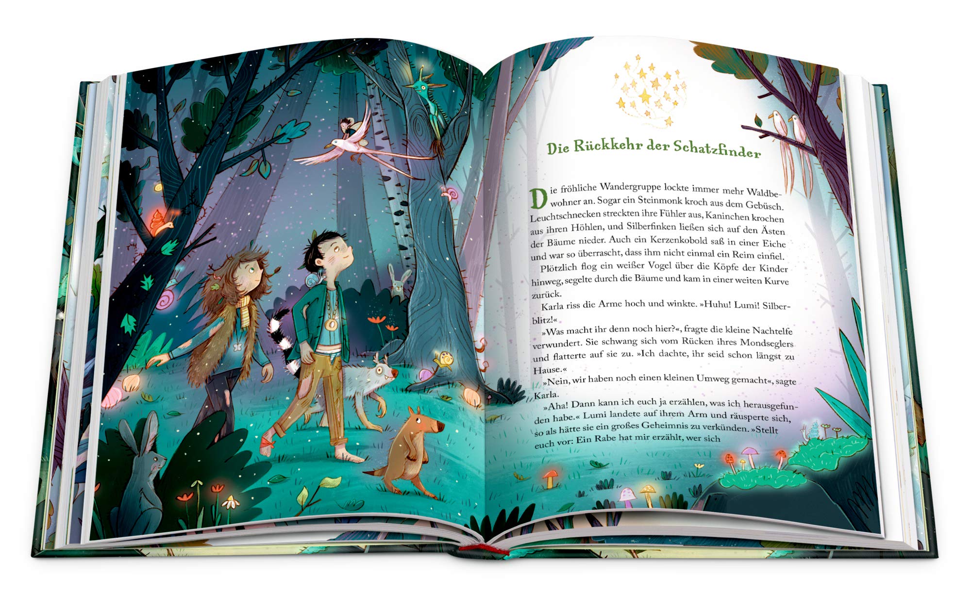 Aber das hält die beiden nicht voneinander ab, Freundschaft zu schließen. Auf dem Felsenschloss sieht Karla zum ersten Mal den versteinerten Hut, in dem die Glückslichter eingeschlossen sind. Seit vielen Jahren fliegen sie nicht mehr. Denn zum Öffnen des Hutes braucht man das magische Amulett, das jedoch verloren gegangen ist. Das wollen Karla und Frederik unbedingt finden. Trotz der Gefahren und dunklen Seiten des Glimmerwaldes. Sie sind sich sicher, gemeinsam werden sie die Herausforderung meistern…