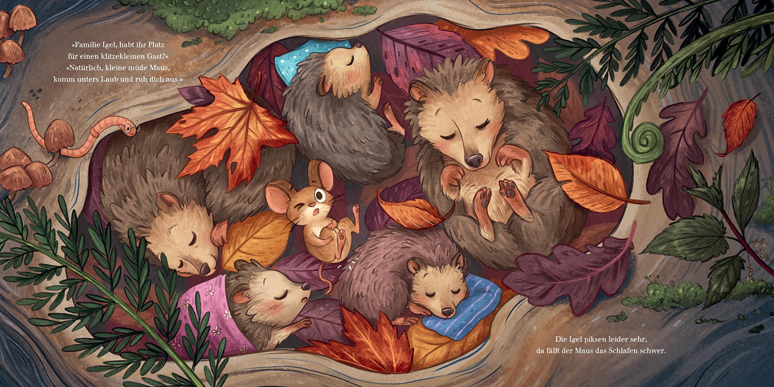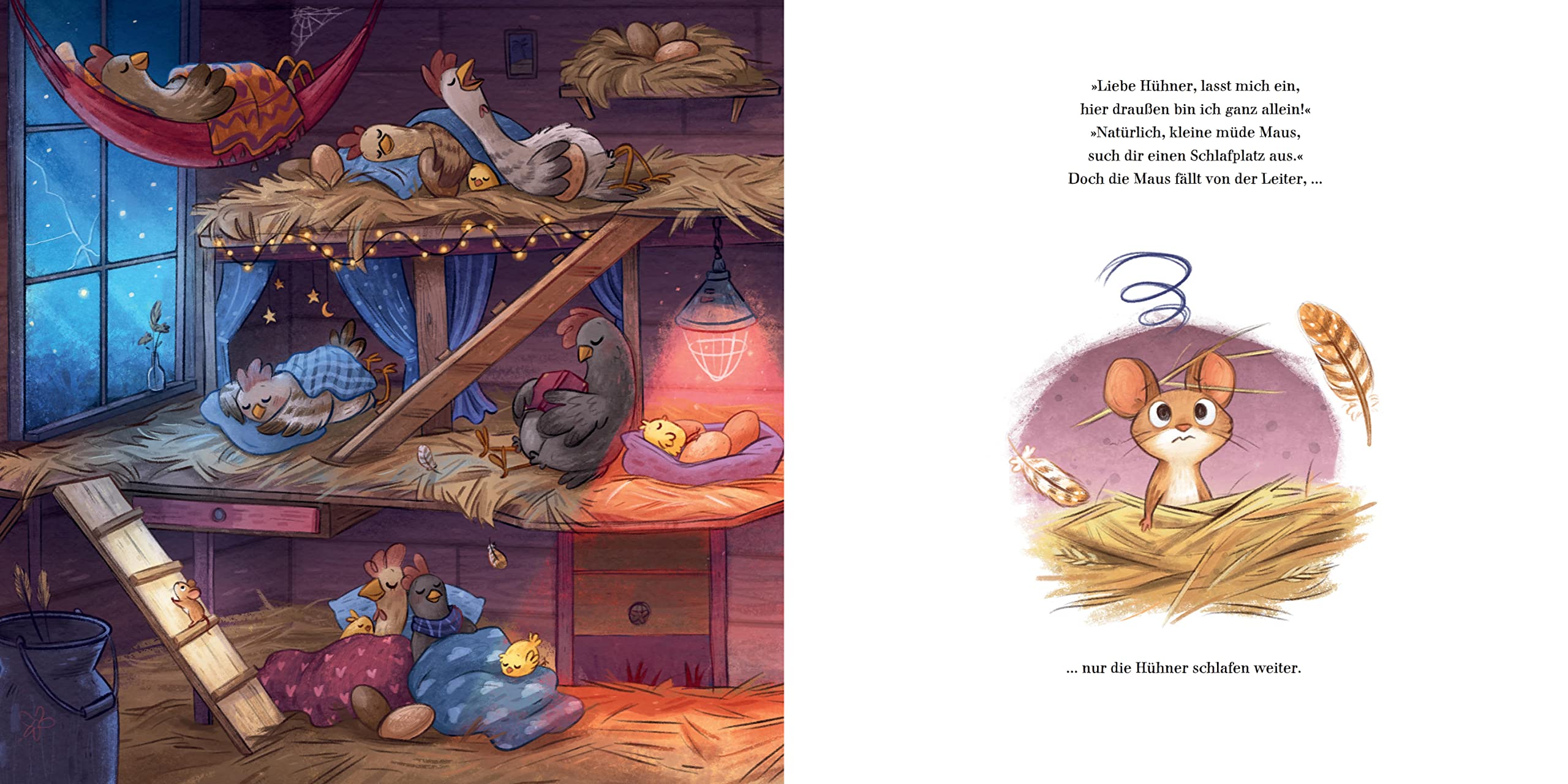 So fragt es bei den Hühnern im Hühnerstall an, ob es dort schlafen kann. Aber dort fällt das kleine Mäusekind von der Leiter. Der Hund schnarcht laut. Familie Igel pikst leider sehr. Die Seerose der Frösche schaukelt doll. Das Nest von Familie Vogel ist zu klein. Und im Bau bei den Maulwürfen gibt es kein Licht. Das Mäuschen ist müde. Wird es den Weg ins eigene Bettchen noch finden?