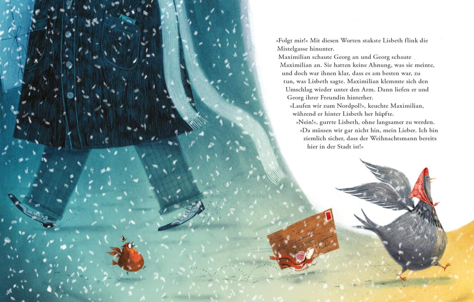 Niemand weiß, ob Olivers Brief von einem Windstoß erfasst wurde oder von einem Hauch der Wintermagie. Der Umschlag schwebt mit den Schneeflocken und tanzt durch die Luft. Wenig später streckt ein kleiner Mäuserich seine Nase unter einem Abfallhaufen hervor. Er schüttelt den Schnee von seinen Ohren, als er ein Rauschen hört. Ein flaches, bräunliches Ding fliegt auf ihn zu. Was ist denn das? Ein Briefumschlag. Adressiert an den Weihnachtsmann. Und heute ist schon Heiligabend. Maus Maximilian darf keine Zeit mehr verlieren. Um den Brief noch rechtzeitig zum Nordpol zu bringen, muss er sofort los…