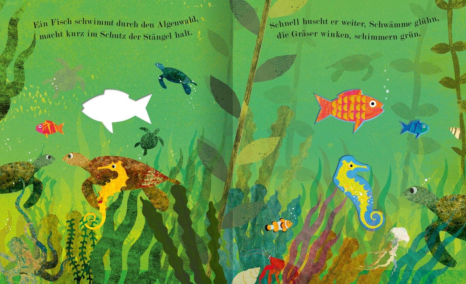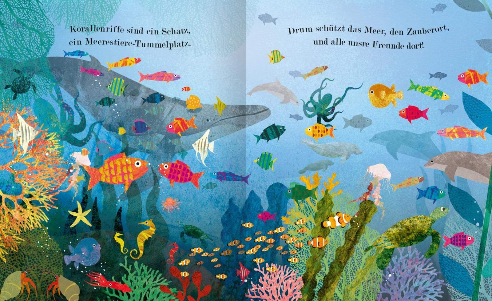 Dessen Schönheit farbenfroh von Britta Teckentrup in Szene gesetzt wird. Einfach gehalten und dennoch akribisch detailliert. In einem Wechsel von hell und dunkel. Ein kunstvoll-unverwechselbarer Stil. Umrahmt von Reimen aus der Feder von Patricia Hegarty. Die Guckloch-Stanzungen und zwei kleine Clownfische, die von Seite zu Seite begleiten, erzeugen zusätzlich einen tollen spielerischen Effekt. Einblicke in eine erstaunliche, schillernde und spannende Wunderwelt.