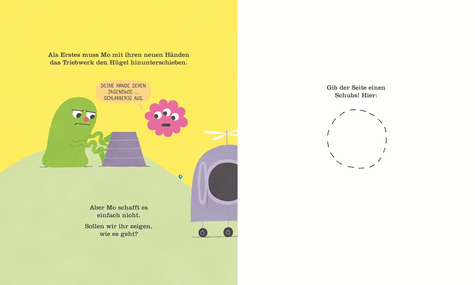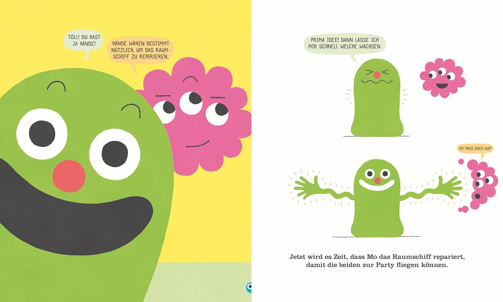Mo und Flo wollen zu Kevins Geburtstagsparty. Leider gibt es ein kleines Problem. Sie müssen notlanden. Das Raumschiff muss repariert werden, und dann kann es auch schon ruck zuck weitergehen. Ohje. Mo und Flo bekommen die Tür vom Raumschiff nicht auf. Sieht so aus, als könnten die beiden eine helfende Hand gebrauchen. Ja, Hände sind bestimmt nützlich, um das Raumschiff zu reparieren. Prima Idee!