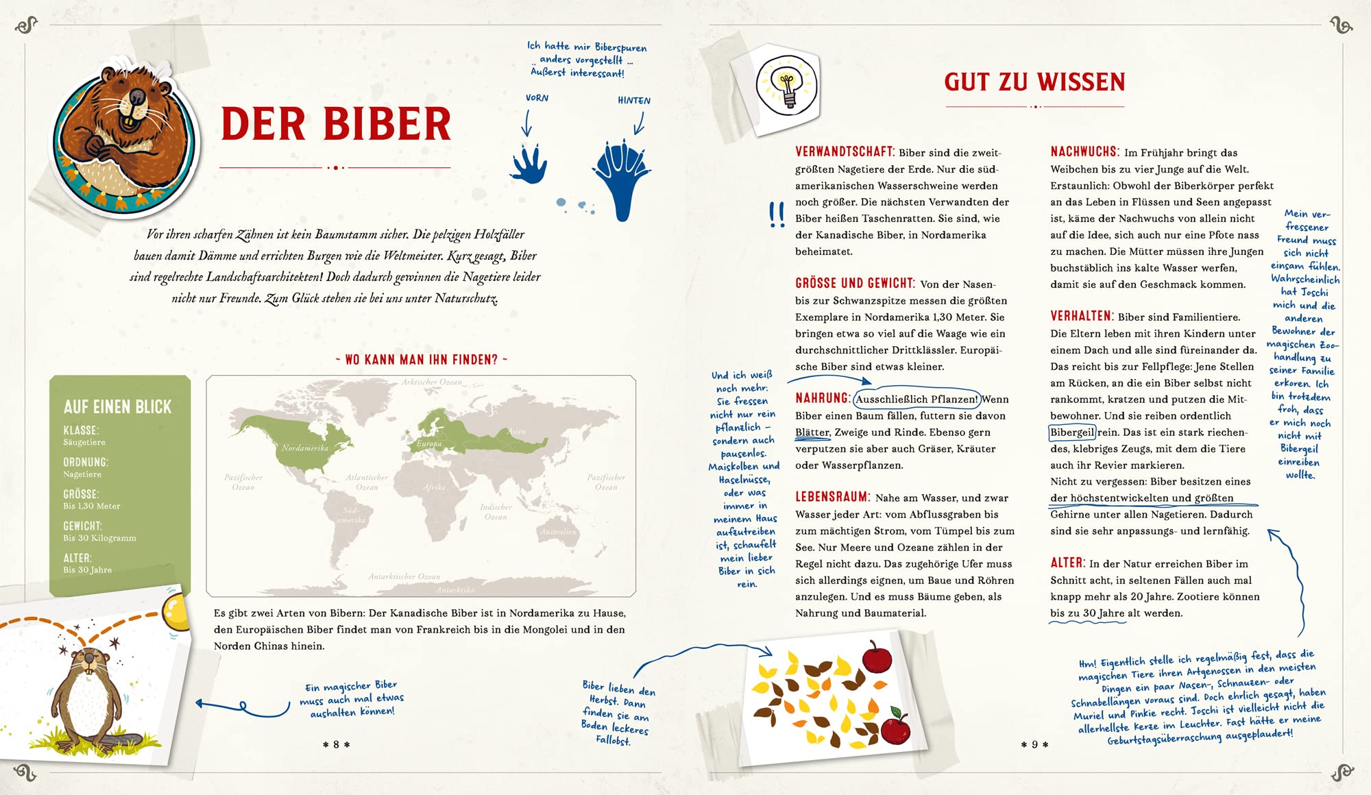 In „Die Schule der magischen Tiere: Mister Morrisons gesammeltes Tierwissen“* von Margit Auer und Martin Verg liegt ein fabelhaftes Leseerlebnis vor euch. Von B wie Biber über L wie Leopard bis hin zu W wie Wolf werden 29 Tiere – bekannt aus „Die Schule der magischen Tiere“ – auf je drei Doppelseiten vorgestellt. Charmant, informativ und unterhaltsam gibt es Wissenswertes zu Aussehen, Ernährung, Lebensweise, Nahrung sowie zum geografischen Lebensraum.