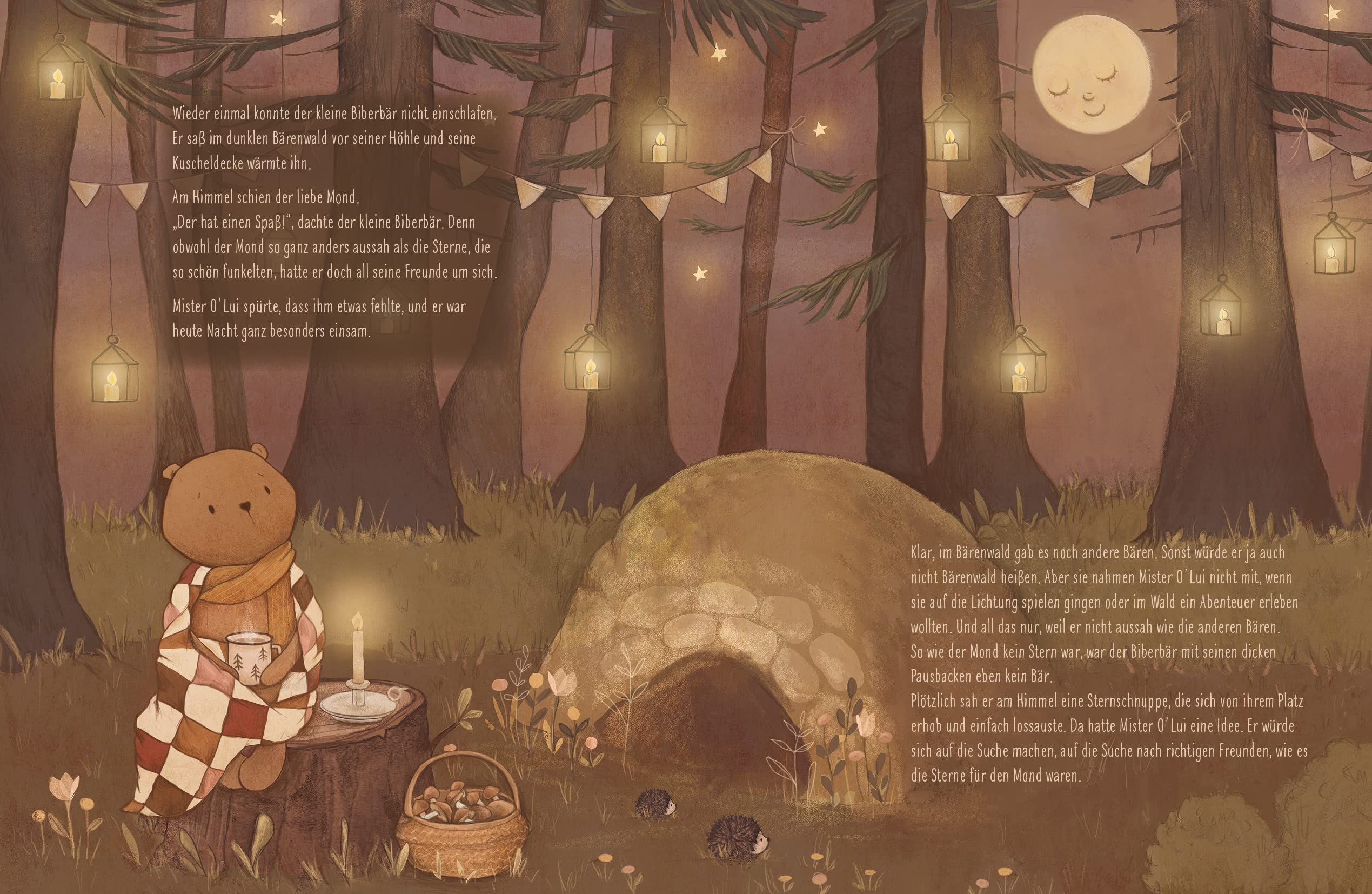 Der kleine Biberbär kann nicht einschlafen. Irgendwas fehlt ihm. Klar, gibt es im Bärenwald noch andere Bären. Aber sie nehmen Mister O‘Lui nicht mit, wenn sie auf die Lichtung spielen gehen oder ein Abenteuer im Wald erleben wollen. Plötzlich sieht er am Himmel eine Sternschnuppe. Da hat der kleine Biberbär eine Idee. Er wird sich auf die Suche machen, auf die Suche nach richtigen Freunden.