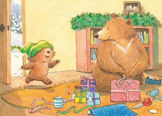 Buntpapier, Schleifen und Girlanden – zusammen mit Mama Bär packt der kleine Bär Weihnachtsgeschenke ein. Da läutet es an der Tür. Der Postbote bringt Weihnachtskarten von Oma und Onkel Lu. Der kleine Bär strahlt. Und erst recht als Papa Bär mit einem großen Tannenbaum das Wohnzimmer betritt. Schnell die Kugeln, Sterne und Kerzen holen. Dann schmücken alle gemeinsam den Weihnachtsbaum.