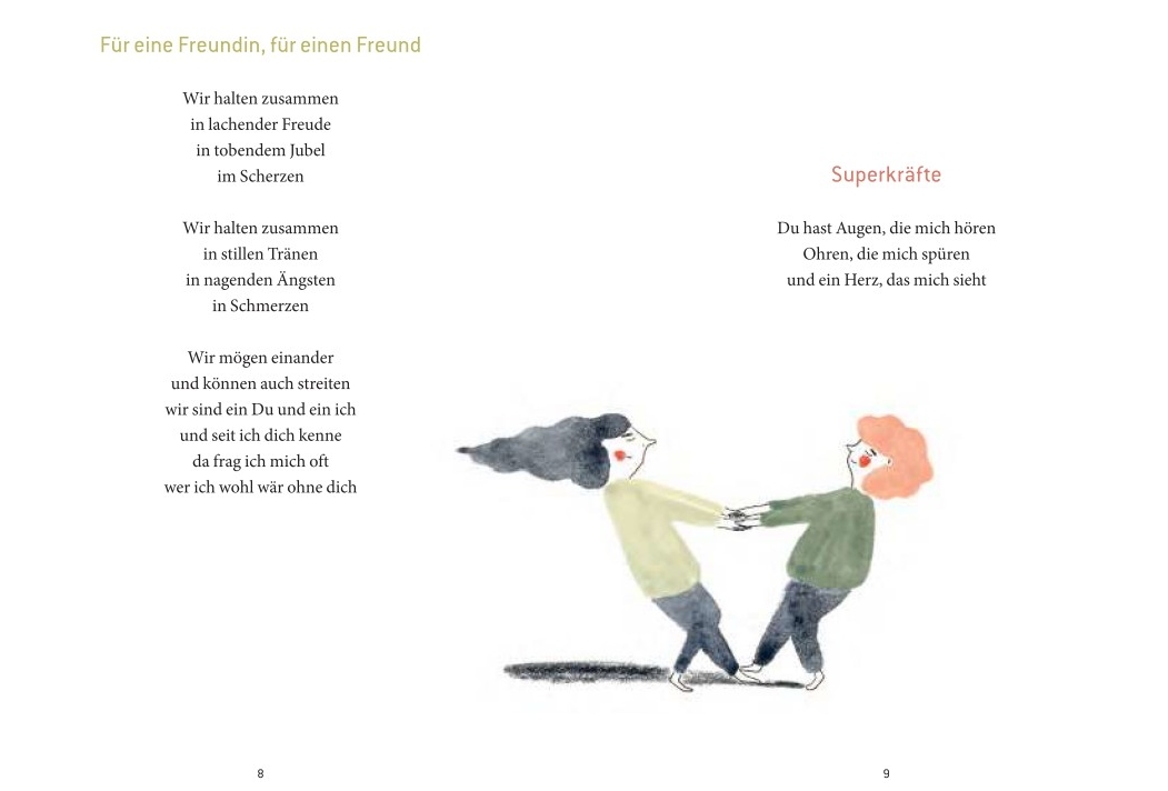 Du schaffst das. Ich hab dich lieb. Du bist mir wichtig. Ich hab dich vermisst. Wir halten zusammen. Ich bin so froh, dass es dich gibt. Wir passen gut aufeinander auf. Komm kuscheln. Es ist schön mit dir. Ich bin für dich da: „Mit Worten will ich dich umarmen“…