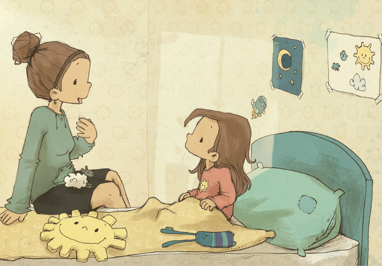 Sooo lange schon versucht Polly einzuschlafen. Aber irgendwie will es nicht klappen. Mama hat schon alle Schlaflieder gesungen, die sie kennt. Aber Polly wird einfach nicht müde. Irgendetwas passt nicht. Da zeigt Polly auf ein Bild mit dem Mond und den Sternen an der Wand. Der Mond ist noch gar nicht da. Die Sonne scheint noch immer. Was fehlt ist ein Mittagsschlaflied! Aber Pollys Mama kennt kein Mittagsschlaflied. Nur Schlaflieder für abends.