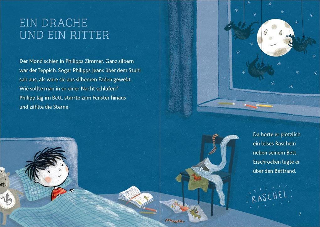 Ganz silbern scheint der Mond in Philipps Zimmer. Philipp liegt im Bett, starrt zum Fenster raus und zählt die Sterne. Da hört er plötzlich ein leises Rascheln. Die Seiten vom Buch, das er vorhin gelesen hat, bewegen sich. Seltsam. Plötzlich rutscht ein Drache aus dem Buch auf den Teppich. Kaum größer als ein Marmeladenglas. Gefolgt von einem weißen Ritter. Aber zum Staunen bleibt keine Zeit: Auf einmal ist Philipp auch nur noch daumengroß und muss sich gemeinsam mit dem Drachen gegen den Ritter kämpfen…