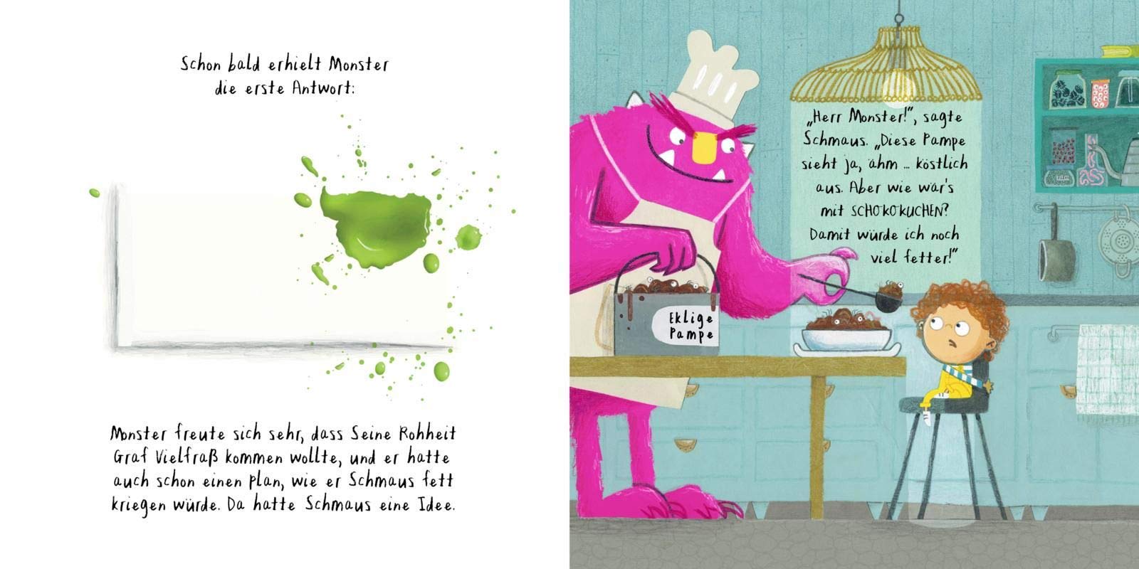 Doch nun hat Monster ein Problem. Graf Vielfraß hätte den Schmaus gern saftig und fett. Madame Gargoyle bevorzugt salzige Snacks. Riese Rambo wünscht sich Schmaus mit ordentlich Matsch und Schleim. Und die Fussel-Fee alles gut gekühlt, gluten- und laktosefrei sowie ohne Knochen. Wie soll Monster das bloß anstellen? Was soll er nur tun, um alle glücklich zu machen? Da hat Schmaus eine Idee…