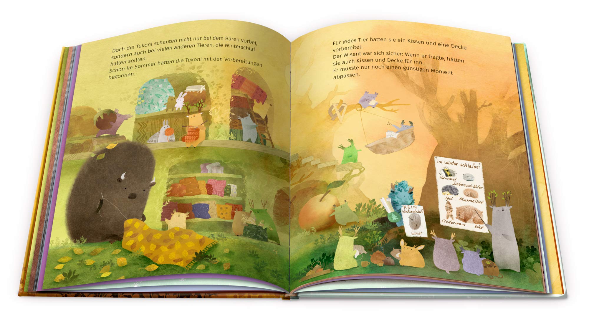 Einmal traf der Wisent den Bären. Der Wisent erzählte, was er erlebte, wenn überall Schnee lag. Das machte den Bären nachdenklich. Bald würde er einschlafen. Und wieder so viel Schönes verpassen. Als die Tukoni, die guten Geister des Waldes, kamen, um ihn ein gemütliches Bett für den Winter zu bereiten, büxte der Bär aus. Auf keinen Fall wollte er schlafen…