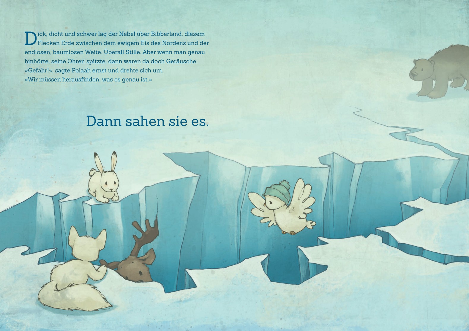 Im dicken Nebel von Bibberland treffen der Polarfuchs Polaah, die Schneeeule Gru-Gru, der Schneehase Hops und der Vielfraß Mampf aufeinander. Von irgendwo her ist ein leises Wimmern zu hören. Das plötzlich zu einem lauten Gebrüll anwächst. Was ist das nur für ein Geräusch, fragen sich die Tiere. Polaah ist sich sicher, dass entweder Gefahr droht oder jemand in Gefahr ist. Und genau das müssen sie herausfinden.