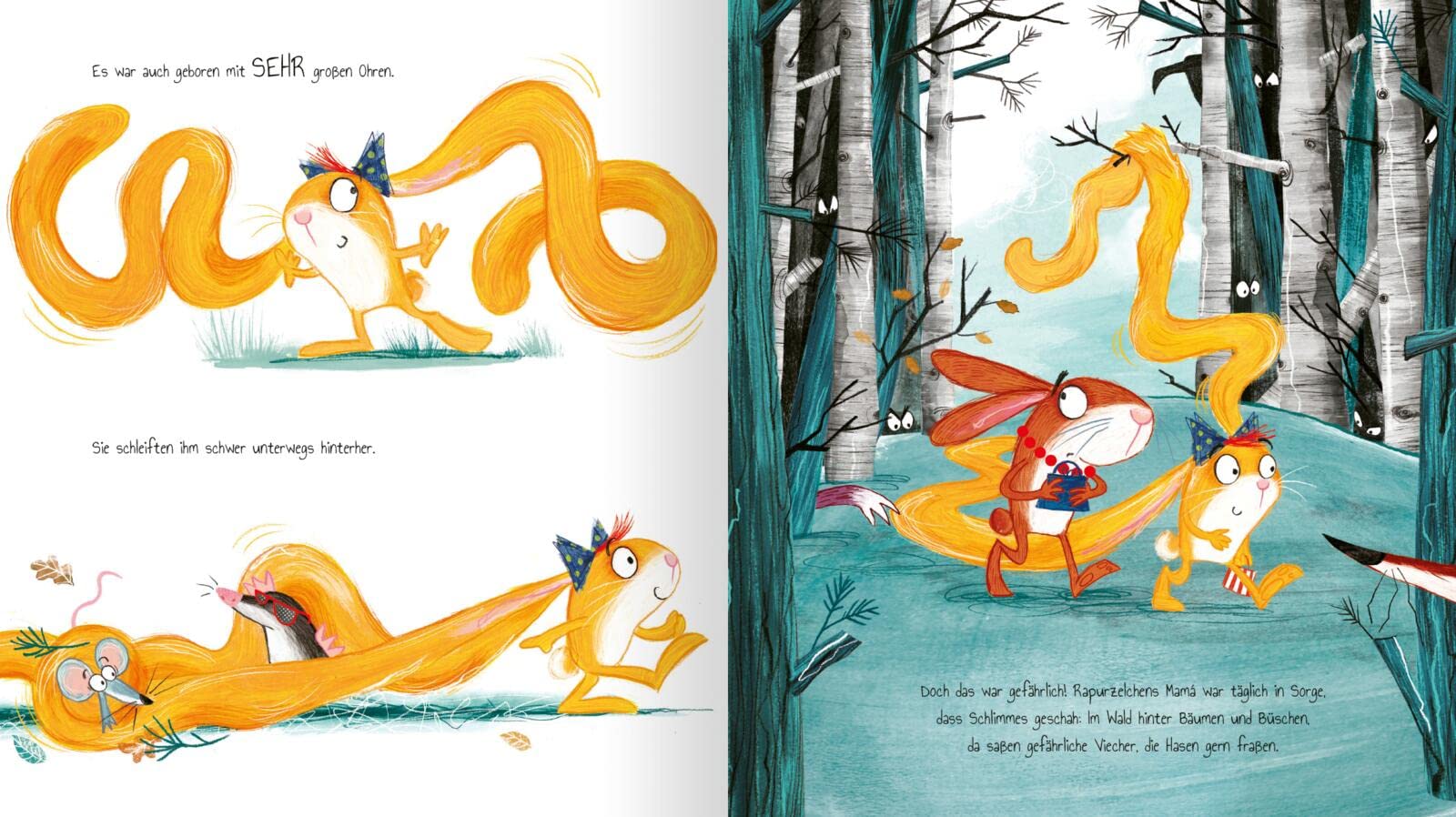 Im Tiermärchenland auf der Wiese am Bergwald lebt ein Häschen. Rapurzel genannt. Rapurzels Mama ist ständig in Sorge, dass ihr etwas Schlimmes passiert. Rapurzel hat sehr große Ohren, die immer hinter ihr her schleifen. Und im Wald hinter all den Bäumen und Büschen sitzen gefährliche Wesen, die gern Hasen fressen. Weil Rapurzel wegen ihrer Langohren immer in großer Gefahr schwebt, versteckt ihre Mutter sie hoch oben in einem Baum. Kein Weg hinauf, hinab oder hinein.