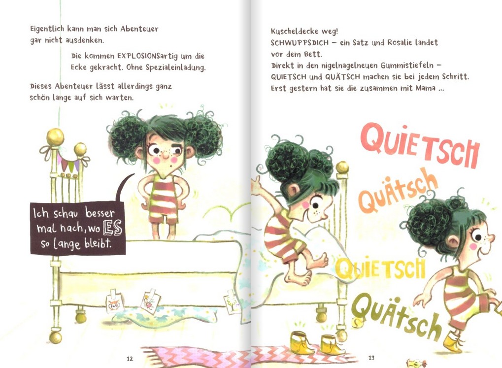 Es ist Samstagmorgen und seit mindestens vierundachtzig Stunden liegt Rosalie in ihrem Bett. So langweilig. Papa und Mama wollen gern ausschlafen. Aber Ausschlafen ist eindeutig nur was für Große, findet Rosalie. Isso. Also Nachthemd ausziehen, etwas anziehen, Bilderbuch anschauen und eins, zwei, drei, vier Bilder malen. Rosalie seufzt und öffnet die Tür zum Schlafzimmer. Papa gähnt und Mama stöhnt. Sie wollen noch schlafen. Deswegen schlägt Papa vor, dass Rosalie mal zur Abwechslung die Brötchen fürs Frühstück holen geht.