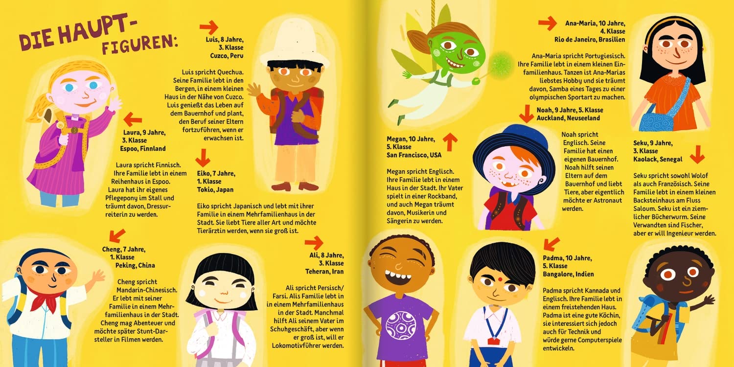 „Schulkinder in aller Welt: So sieht mein Tag aus!“: Laura aus Finnland, Luis aus Peru, Cheng aus China, Ali aus dem Iran, Eiko aus Japan, Megan aus den USA, Ana-Maria aus Brasilien, Padma aus Indien, Noah aus Neuseeland und Seku aus Senegal zeigen einen typischen Tag in ihrem Leben und erzählen von ihren Hobbys, Schulsachen, Bräuchen, Lieblingsessen, Wünschen sowie Träumen…