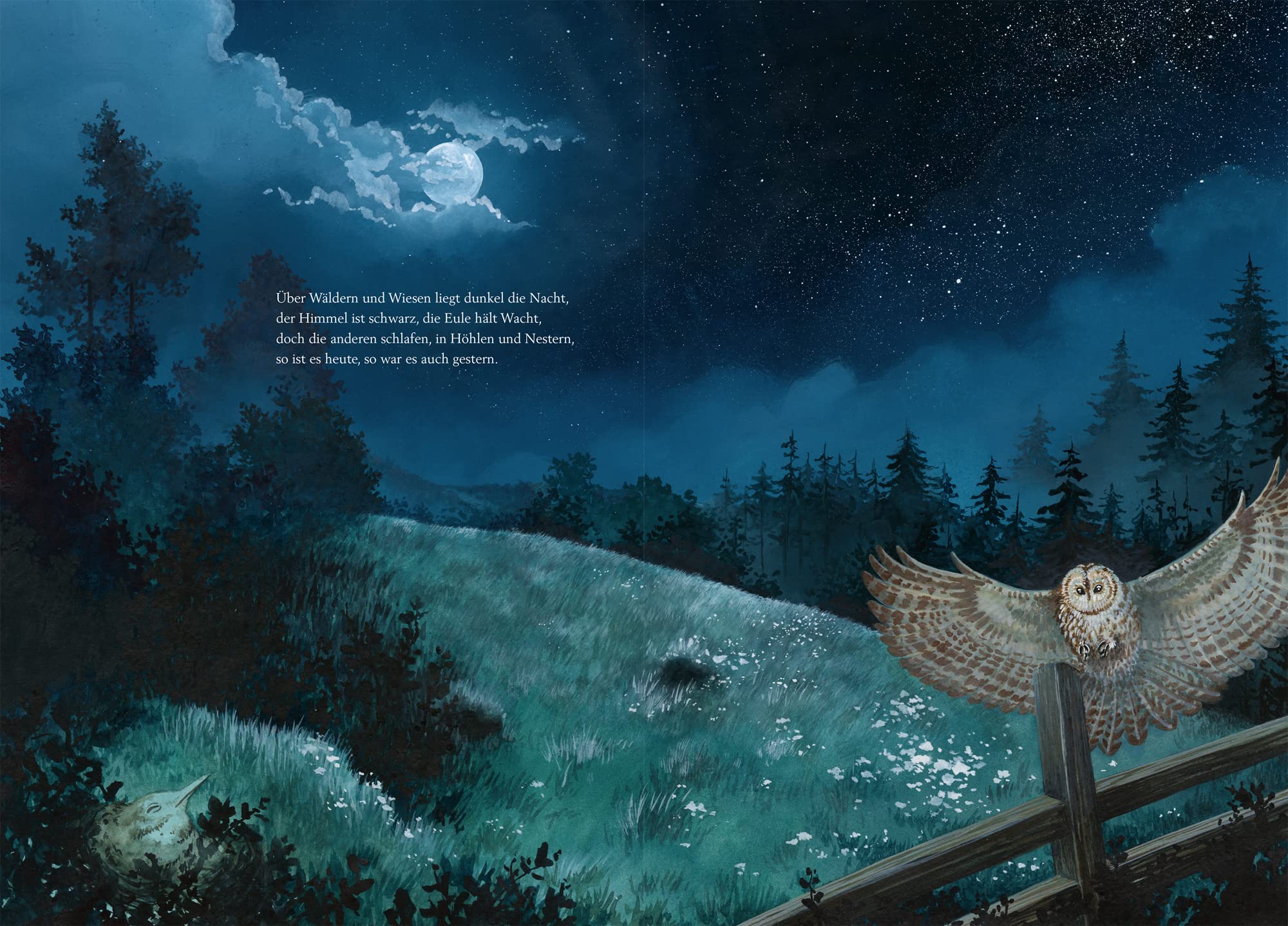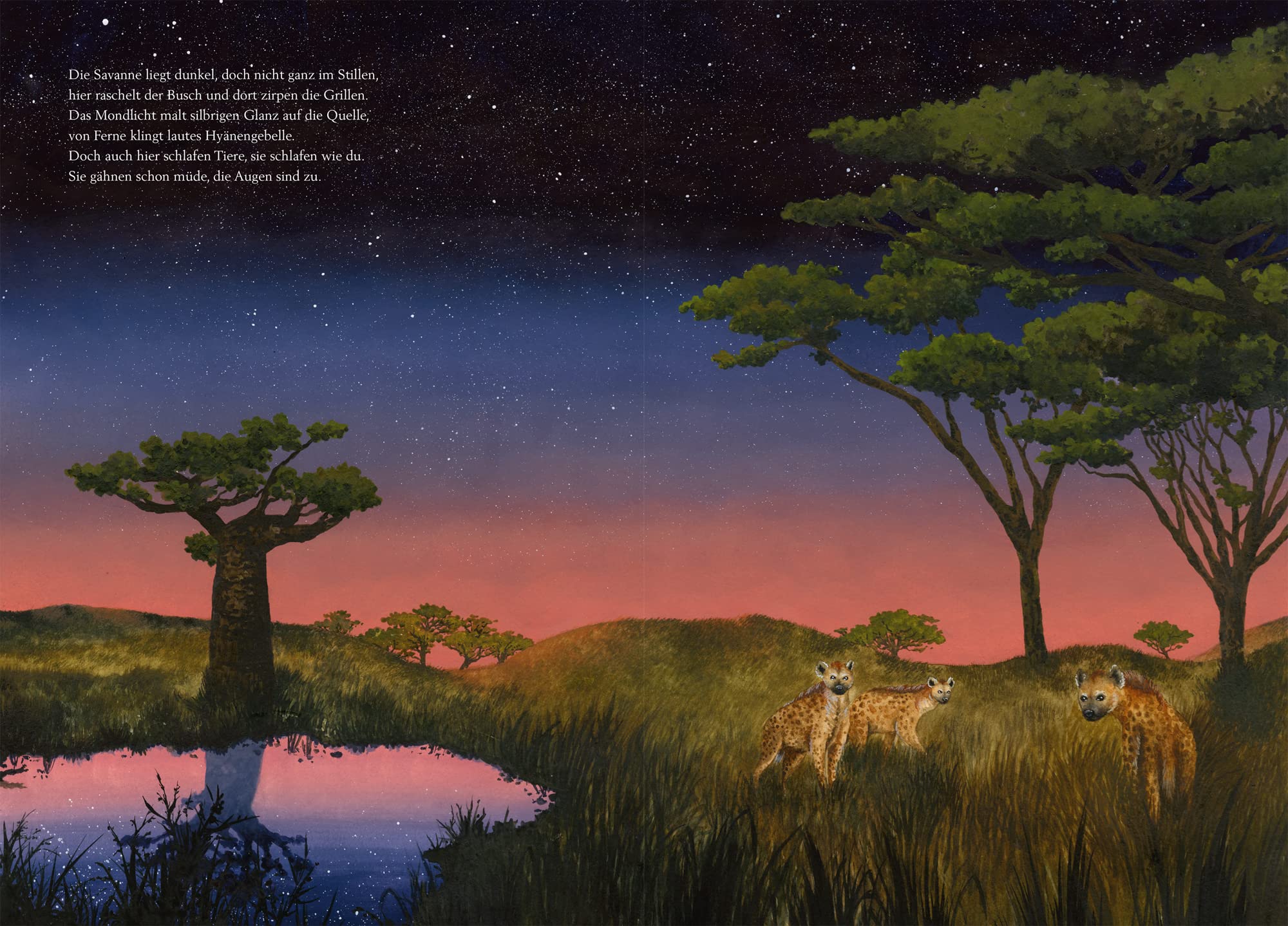 Am Himmel leuchten tausende Sterne bei Nacht. Das Mondlicht hüllt alles in silbrigen Glanz. Und nicht nur die Menschen betten sich zur Ruh. Hoch oben im Baum, versteckt in einem Kobel, träumt das Eichhörnchen. Die Erdmännchen kuscheln, ganz nah, Arm in Arm. Der Kaiman schläft manchmal mit offenem Maul. Der Eisbär benutzt seine Pfoten als Kissen. Das Gürteltier schläft eigentlich immer und die Maus rollt sich in ein kuschliges Wollnest ein: „So schlafen die Tiere“…