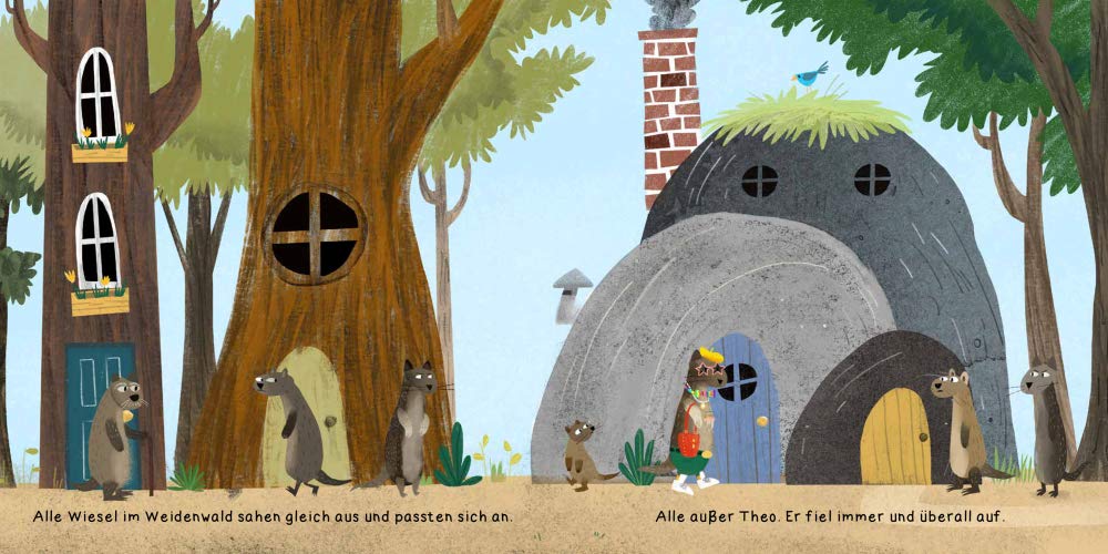 Im Weidenwald sehen alle Wiesel gleich aus. Alle außer Theo. Er fällt immer und überall auf. Das ärgert die anderen Wiesel. Es geht ihnen gegen den Strich, dass Theo Kleidung trägt. Warum kann Theo nicht „normal“ sein so wie sie? Sie versammeln sich, um über Theo zu reden und beschließen, etwas zu unternehmen. Die Wiesel demonstrieren öffentlich gegen ihn. Theo ist verwirrt und traurig.