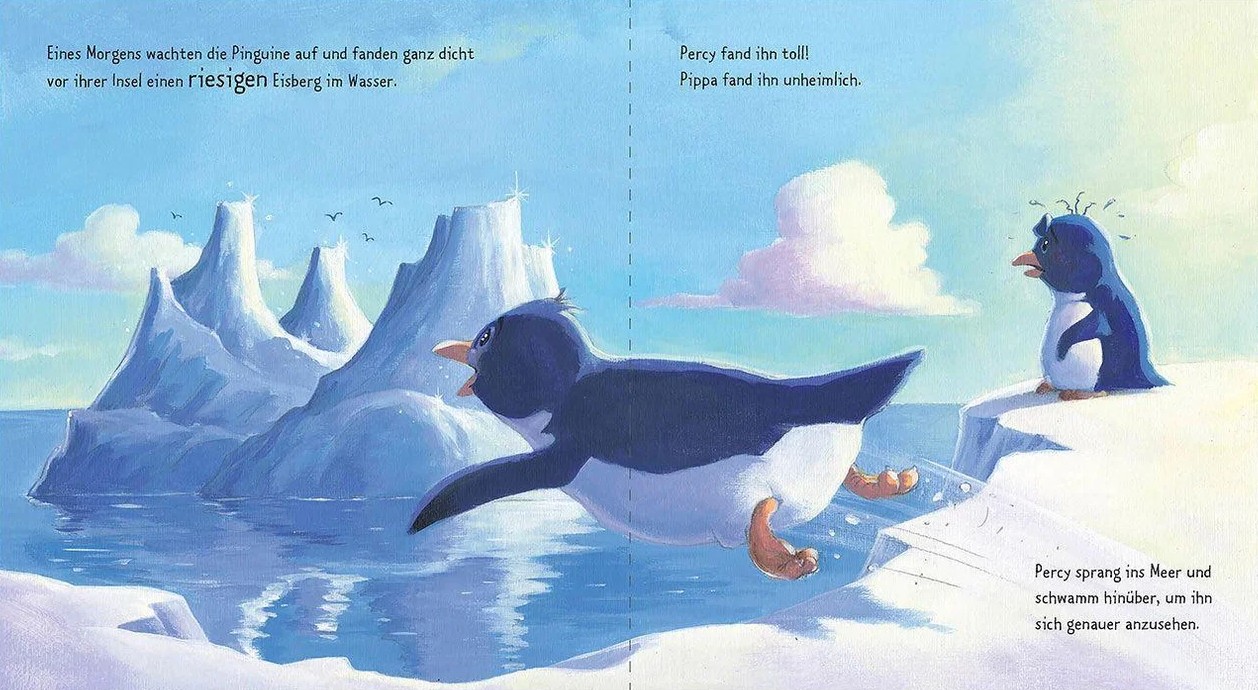 „Trau dich, kleiner Pinguin!“: Percy Pinguin hat vor nichts Angst. Er liebt es, auf dem Bauch die verschneiten Hügel hinab zu sausen. Pippa Pinguin ist nicht ganz so mutig. Pippa hat vor vielen Dingen Angst: Vor Schneestürmen, der Höhe oder lauten Geräuschen. Doch als eines Tages Percy spurlos verschwindet, nimmt sie all ihren Mut zusammen, um ihn zu suchen…