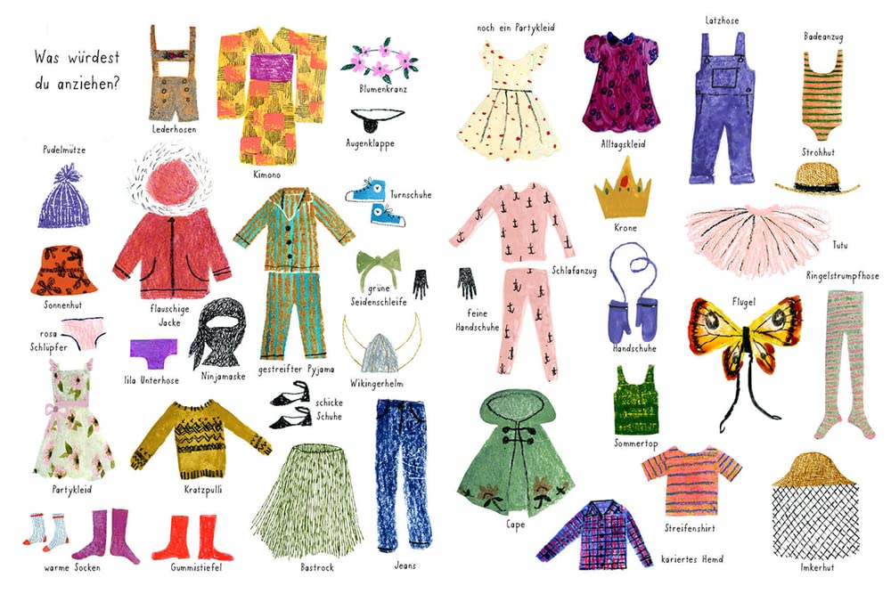 Raus aus den Federn. Der Tag beginnt. Was ziehe ich an? Vielleicht den gestreiften Pyjama oder den Bastrock oder die flauschige Jacke! Passen dazu Zopfschleifen oder der Seitenpferdeschwanz oder ganz einfach verstrubbelte Haare? Hopsala – beinahe hätte ich das Frühstück vergessen. Ob Pfannkuchen oder Ei oder Reis: Es gibt so viel Auswahl.