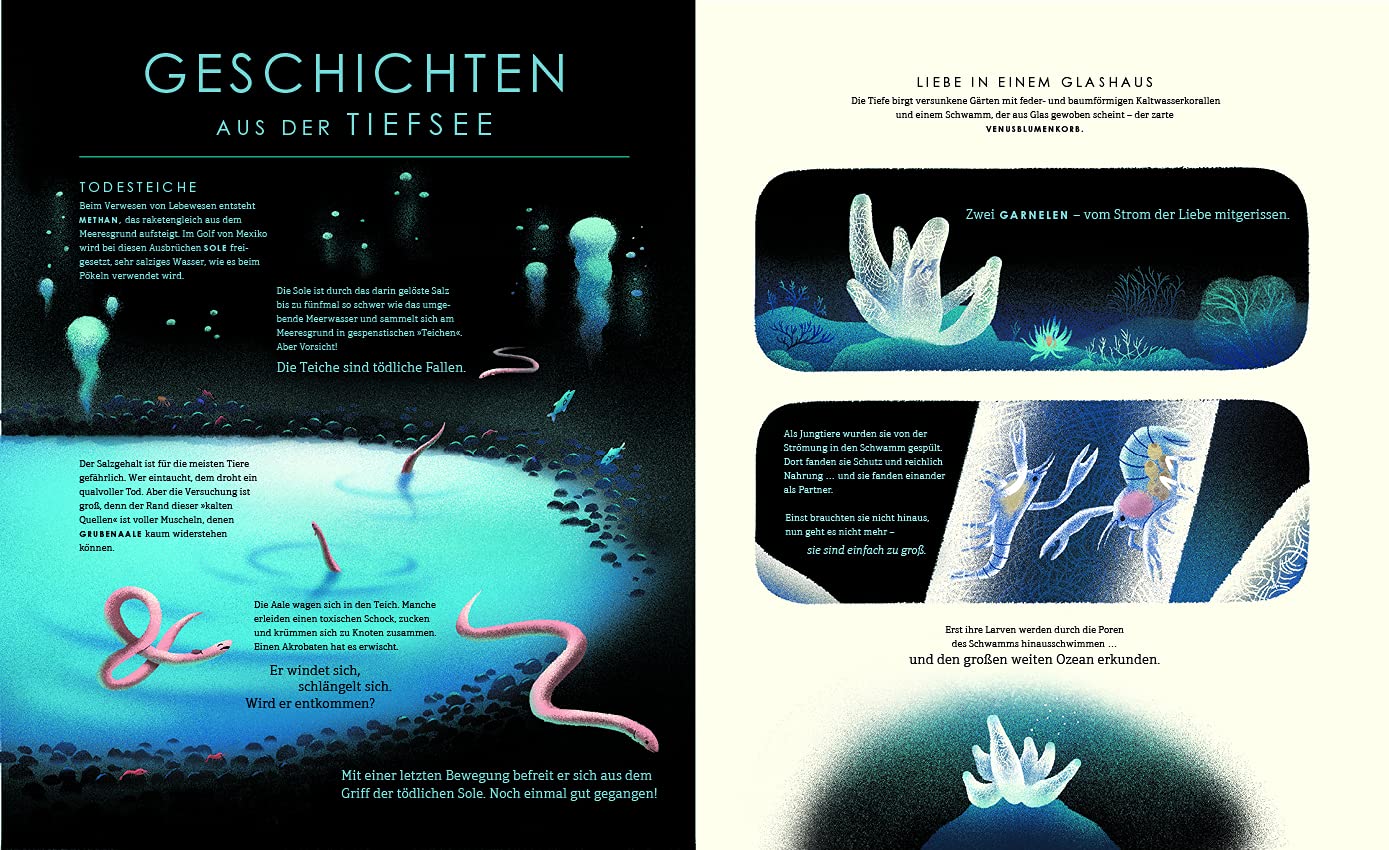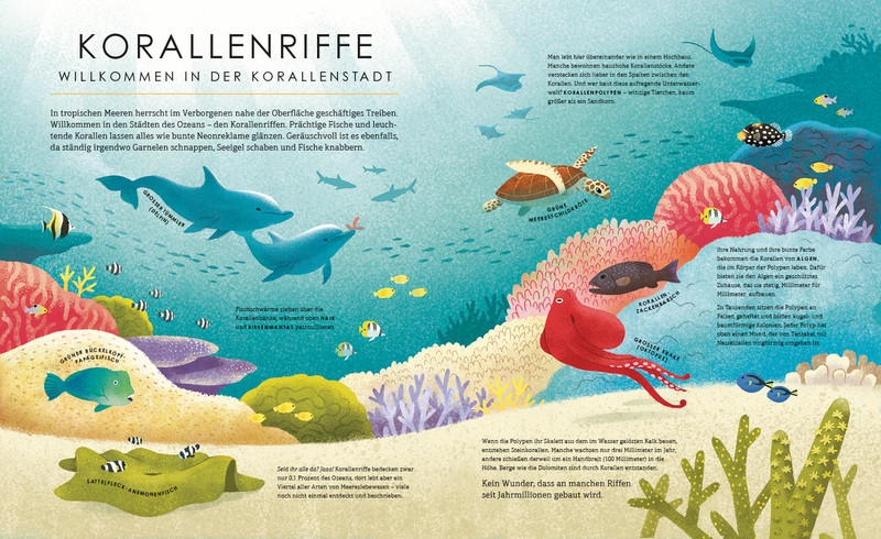 „Unser blauer Planet – Der Ozean“* von Leisa Stewart-Sharpe ermöglicht es, abzutauchen und die Tiefen des Ozeans zu erkunden. Eine wunderbare Einführung in die verborgene Welt unter den Wellen, vollgepackt mit faszinierenden Informationen und atemberaubenden Illustrationen. Es geht zu Korallenriffen, die in einem Kaleidoskop von Farben schimmern bis hin zum Grund des Ozeans, wo Lebewesen jenseits der Vorstellungskraft im Dunkeln leben.