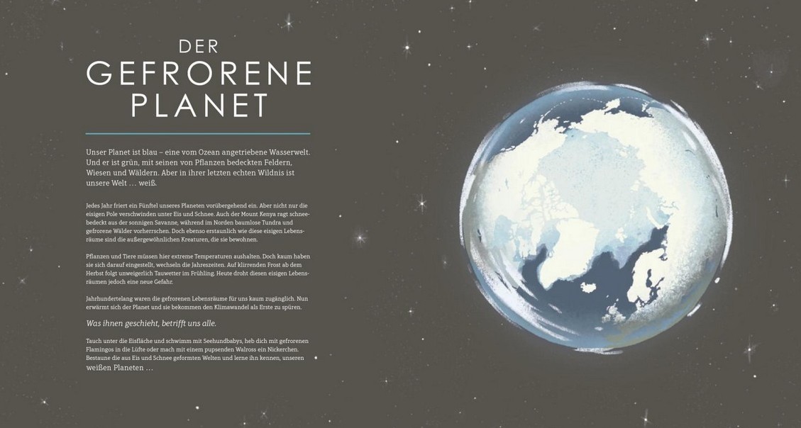 Unsere Erde ist blau – eine von Wasser umflossene Welt. Unsere Erde ist grün – bedeckt mit Pflanzen auf Feldern, Wiesen und Wäldern. Aber in ihrer echten Wildnis ist unsere Erde weiß. Jedes Jahr friert ein Fünftel unserer Welt ein. Ebenso erstaunlich wie die aus Eis und Schnee geformten Welten sind die Lebewesen, die sie bewohnen: „Unser weisser Planet – Eisige Welten“…