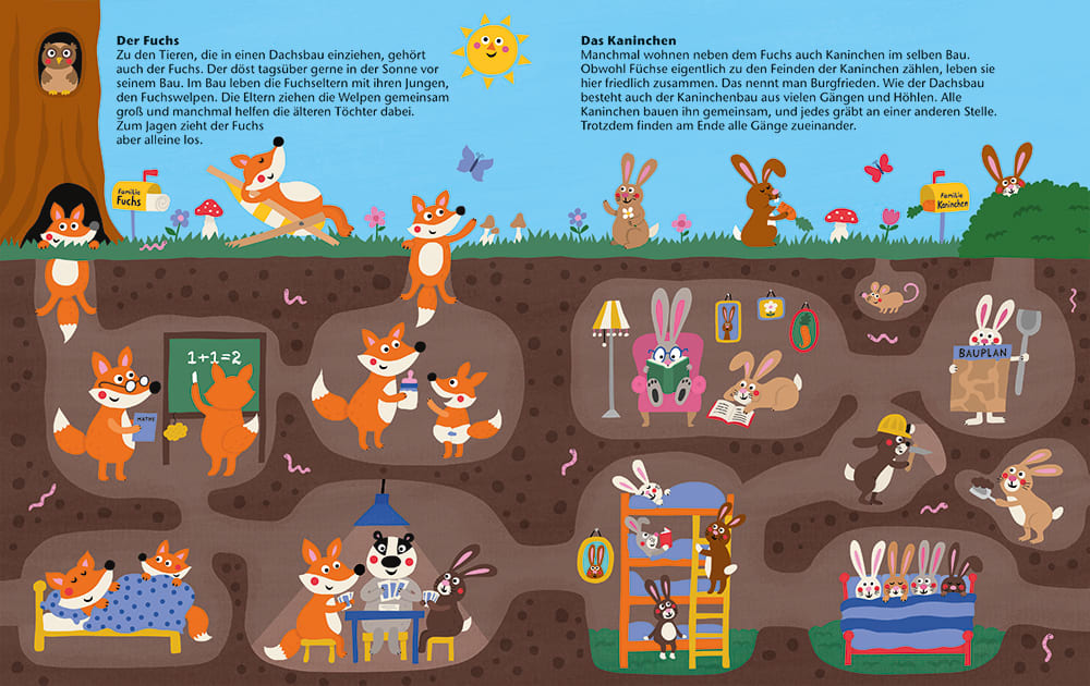 Hier steht neben der Vermittlung von erstem Sachwissen vor allem der Spaß am Buch, Entdecken und Anschauen im Vordergrund. In Hochbetten schlafende Kaninchen, Sandburgen bauende Maulwürfe oder Zähne putzende Biber gibt es wie dargestellt nicht wirklich, aber die augenzwinkernden Illustrationen und Situationen veranschaulichen den Text so auf spielerische Weise und nachvollziehbar für die Zielgruppe. Ein fröhlicher und unterhaltsamer Einblick in diesen für unsere Augen versteckten Lebensraum.