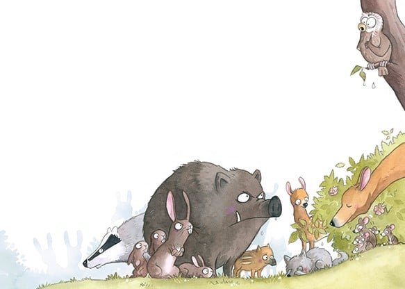 Ein Gewitter tobt über das Land und Blitze zerteilen den Himmel. Ein Blitz schlägt in die alte Fichte im Wald ein und setzt sie in Flammen. Sofort sprühen Funken und die Bäume fangen an zu brennen. Die Tiere rennen so schnell sie können: Familie Wildschwein, Familie Reh, Familie Waldmaus, Familie Dachs, Familie Fuchs, Familie Hase, Familie Kaninchen und Familie Igel verlassen den Wald. Erschöpft und in Sicherheit versammeln sie sich unter den Heckenrosensträuchern am Rande der Wiese. Da hören sie ein leises „Mama“. Ein kleines puschliges Tierkind hat den Kopf zwischen seinen Pfoten versteckt.