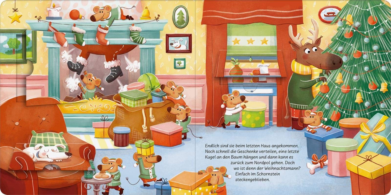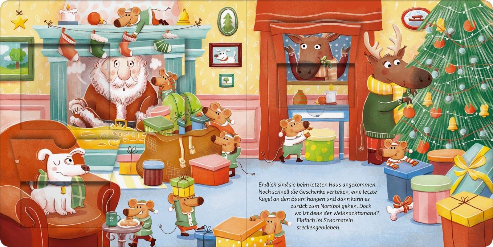 Endlich geht es los. Zu den Kindern. Von Haus zu Haus werden die Geschenke verteilt. Aber wo ist eigentlich der Weihnachtsmann? Upps… im Schornstein steckengeblieben. Gemeinsam schaffen sie es. Ein ganz schön anstrengender und aufregender Tag. Auf geht es: Zurück zum Weihnachtshaus, wo Weihnachtsfrau, Weihnachtswichtel, Weihnachtsbaum und Weihnachtsschmaus schon warten…