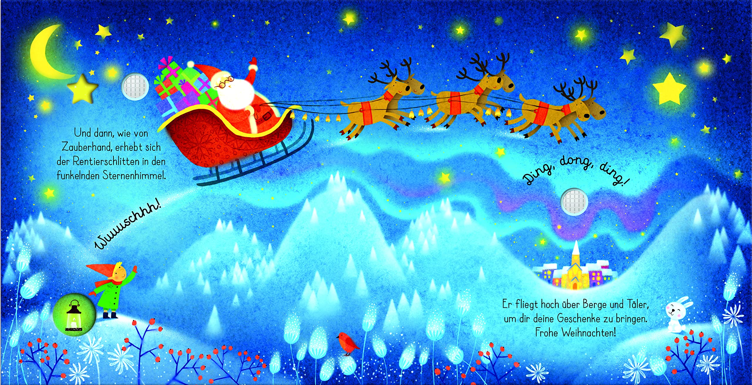 Am Heiligabend wird der Schlitten mit den Rentieren angespannt. Erklingen die Glöckchen der Rentiere, kommt der Weihnachtsmann in seinen dicken Stiefeln durch den Schnee gestapft. Die Wichtel beladen den Schlitten mit den Geschenken. Ist alles bereit, hebt der Schlitten ab und saust durch den funkelnden Sternenhimmel…