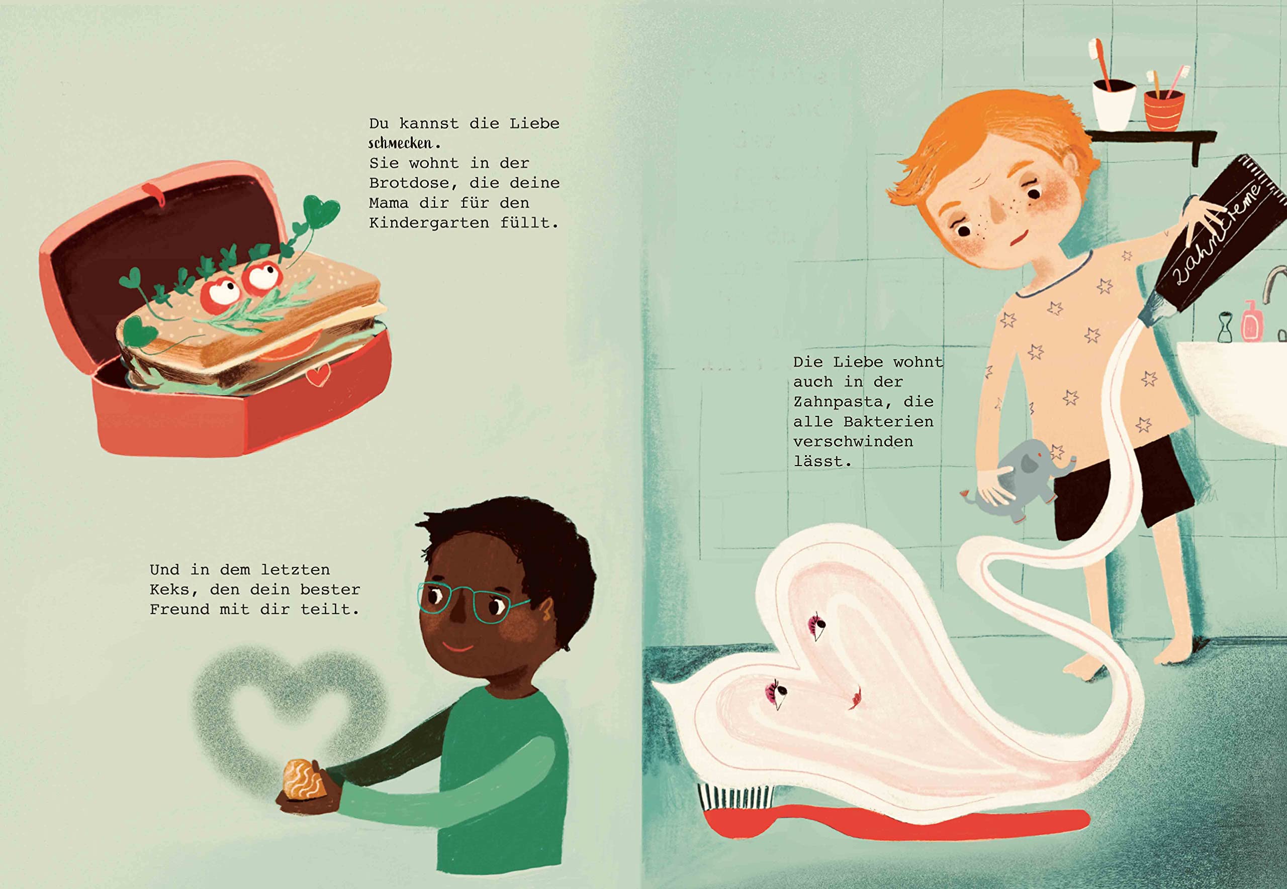Tom ist zu Besuch bei Opa Karl. Er möchte von ihm gern wissen, wo die Liebe wohnt. Das ist eine schwierige Frage. Opa Karl überlegt. Die Liebe kann ganz unterschiedliche Formen annehmen. Sie sieht nie gleich aus. Aber, wenn man aufmerksam ist, kann man sie erkennen. Die Liebe kann man schmecken. Sie wohnt im Keks, den ein Freund mit dir teilt. Die Liebe wohnt im Lieblingsessen. Die Liebe kann man riechen. Sie wohnt im vertrauten Geruch des Haustieres.