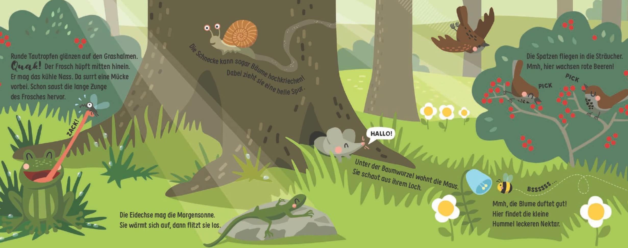 Tautropfen glitzern auf den Grashalmen. Die Eidechse wärmt sich in der Morgensonne auf. Und auch die Maus schaut unter der Baumwurzel aus ihrem Loch heraus. Überall rischelt und raschelt es. Auf leisen Pfoten schleicht der Fuchs durch die Blätter. Der Igel erschrickt und rollt sich ein. Die Rehe knabbern frische Zweige ab, und die Wildschweine schubbern sind an den Baumrinden…