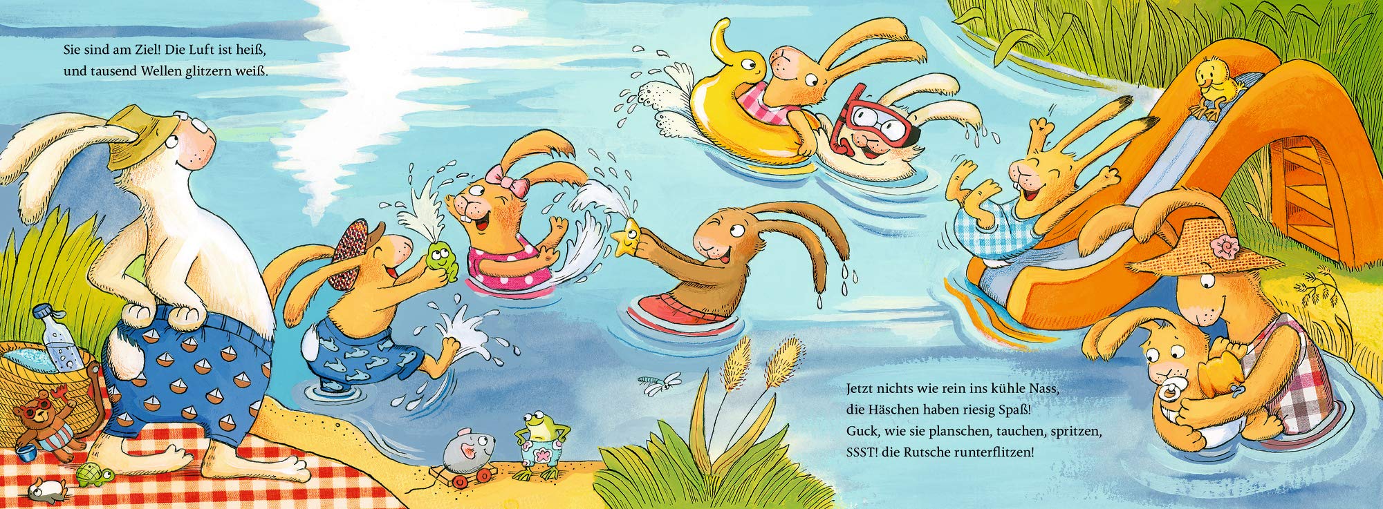 Sommer, Sonne, Badespaß: „Wenn sieben kleine Badehasen quietschfidel ans Wasser rasen“ müssen viele Dinge eingepackt sowie Näschen eingecremt werden, und das Essen fürs Picknick der ganzen Hasenbande darf auch nicht fehlen. Und dann nichts wie ab zum Badesee. Tauchen, schwimmen, planschen und das herrlich kühle Wasser genießen…