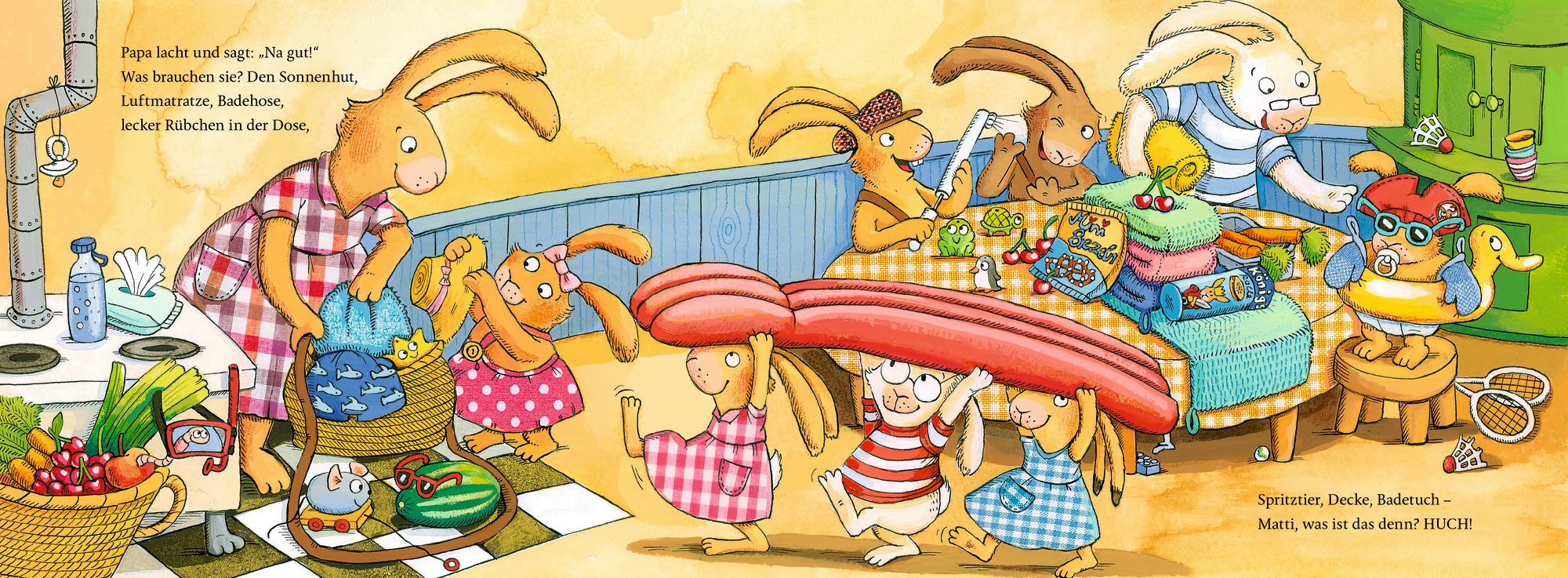 Was für ein herrlicher Sommertag und endlich Wochenende. Mama klappt den Rechner zu und Papa hat den Einkauf erledigt. Juchu, sieben kleine Hasen freuen sich. Sie wünschen sich einen Ausflug. Baden gehen wäre so toll. Mama und Papa sind schnell überredet. Zusammen suchen sie alles zusammen, was sie brauchen: Sonnenhüte, Luftmatratze, Badehosen, Decke und Badetücher: