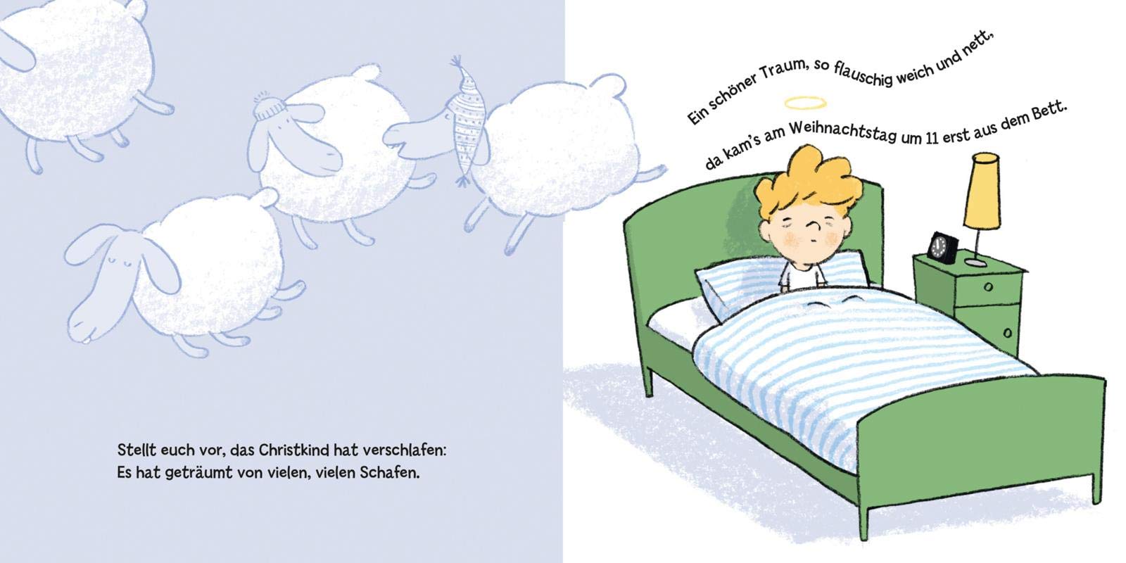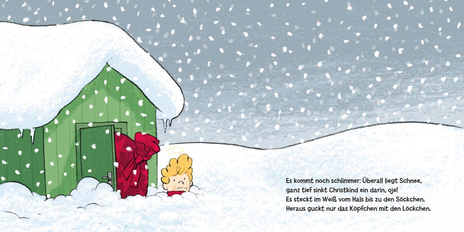 „Wie das Christkind fast Weihnachten verschlafen hat“: Weihnachtsmorgen und das Christkind wacht zu spät auf. Fix zieht es sich an und will sich auf den Weg machen. Aber draußen liegt so viel Schnee. Trotzdem schafft es, den großen Geschenkesack auf den Schlitten zu hieven. Doch der bricht entzwei. Oje! Was wird denn nun aus all den Weihnachtsplänen?