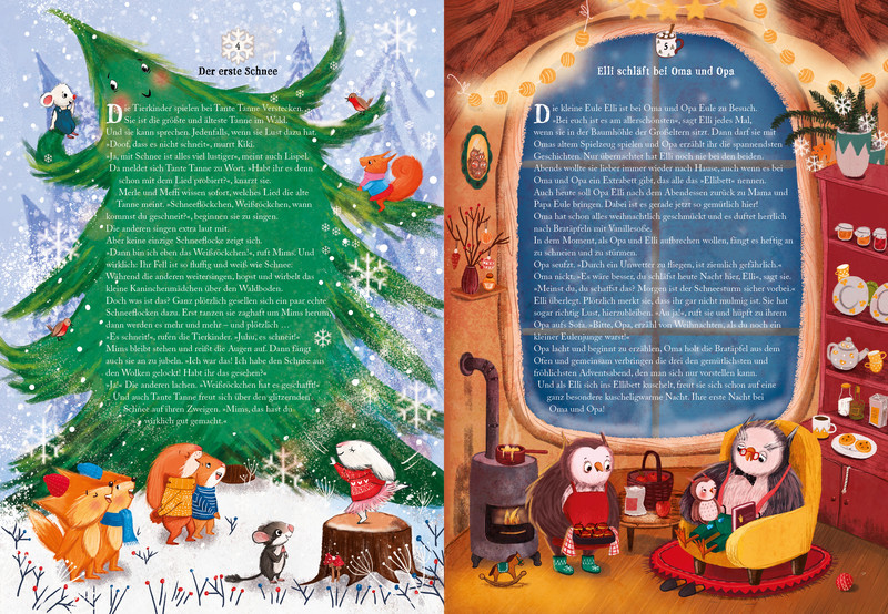 Wie die Tierkinder auf Weihnachten warten: Adventskalendergeschichten 4 mit Schnee bei einer Tanne und 5 mit Eulengroßeltern