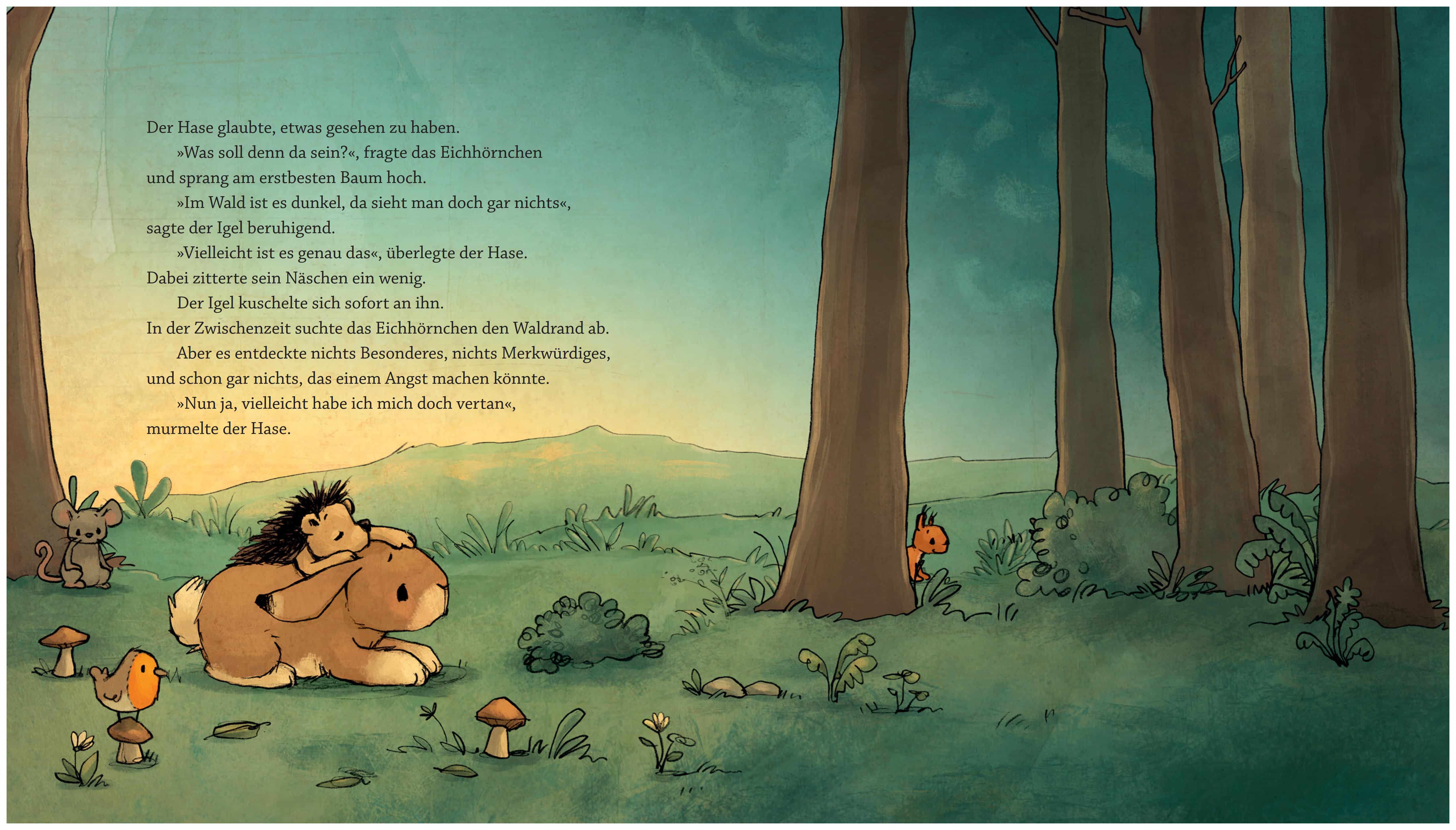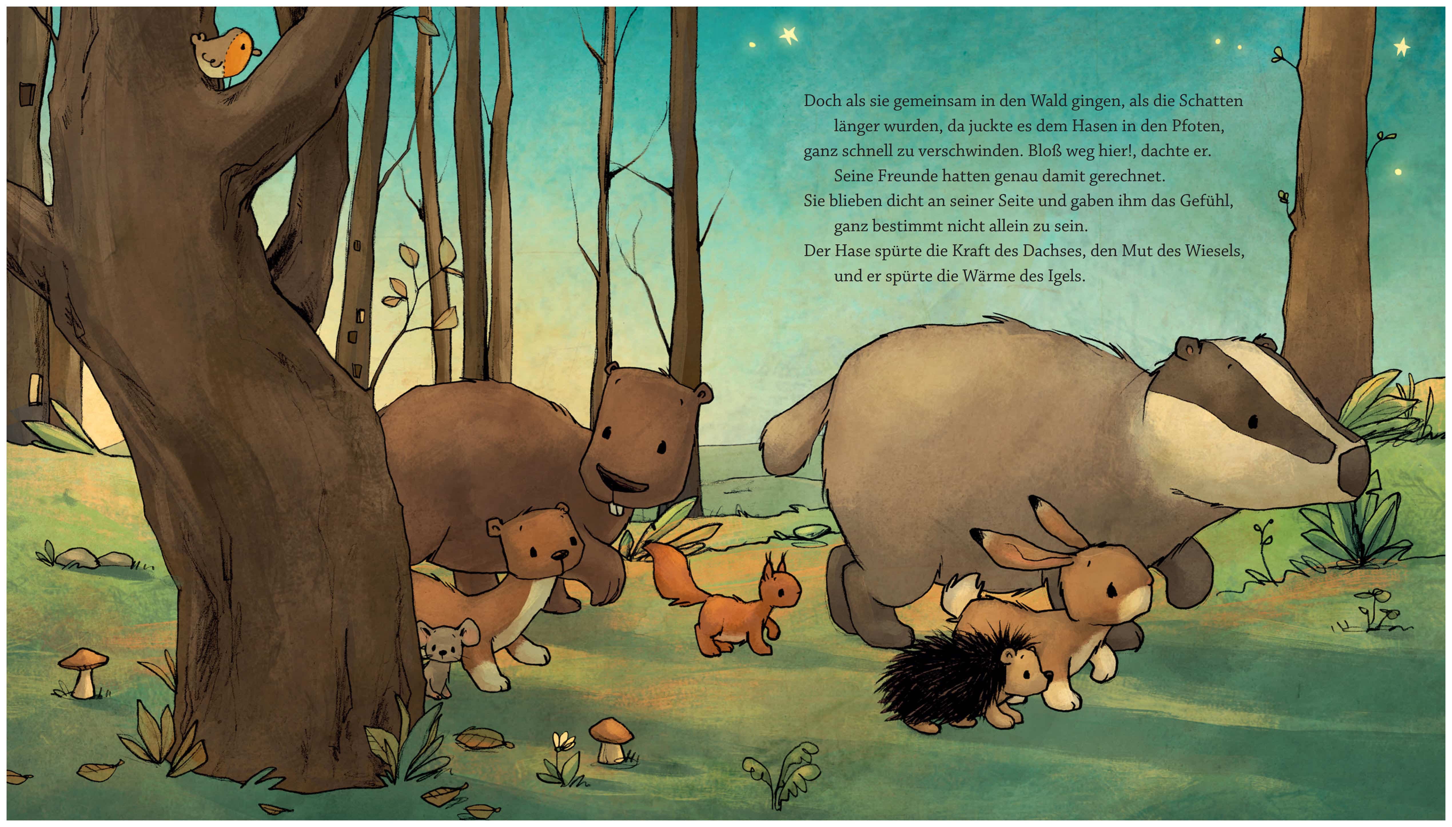 Sie überlegen hin und her, vor und zurück und auch nochmal ganz anders. Eine Idee folgt der nächsten. Bis sie schließlich eine gute haben. Mit allen gemeinsam soll Hase in den Wald gehen, um den Angststein zu suchen. Einen Stein, der ihm alle Angst nimmt. Hase stimmt zögerlich zu. Doch je tiefer sie in den Wald gelangen, umso mehr möchte Hase davonhüpfen. Doch damit haben seine Freunde gerechnet. Sie bleiben dicht an seiner Seite und zeigen ihm, dass er nicht allein ist. Hase spürt die Kraft des Dachses, den Mut des Wiesels und die Wärme des Igels…