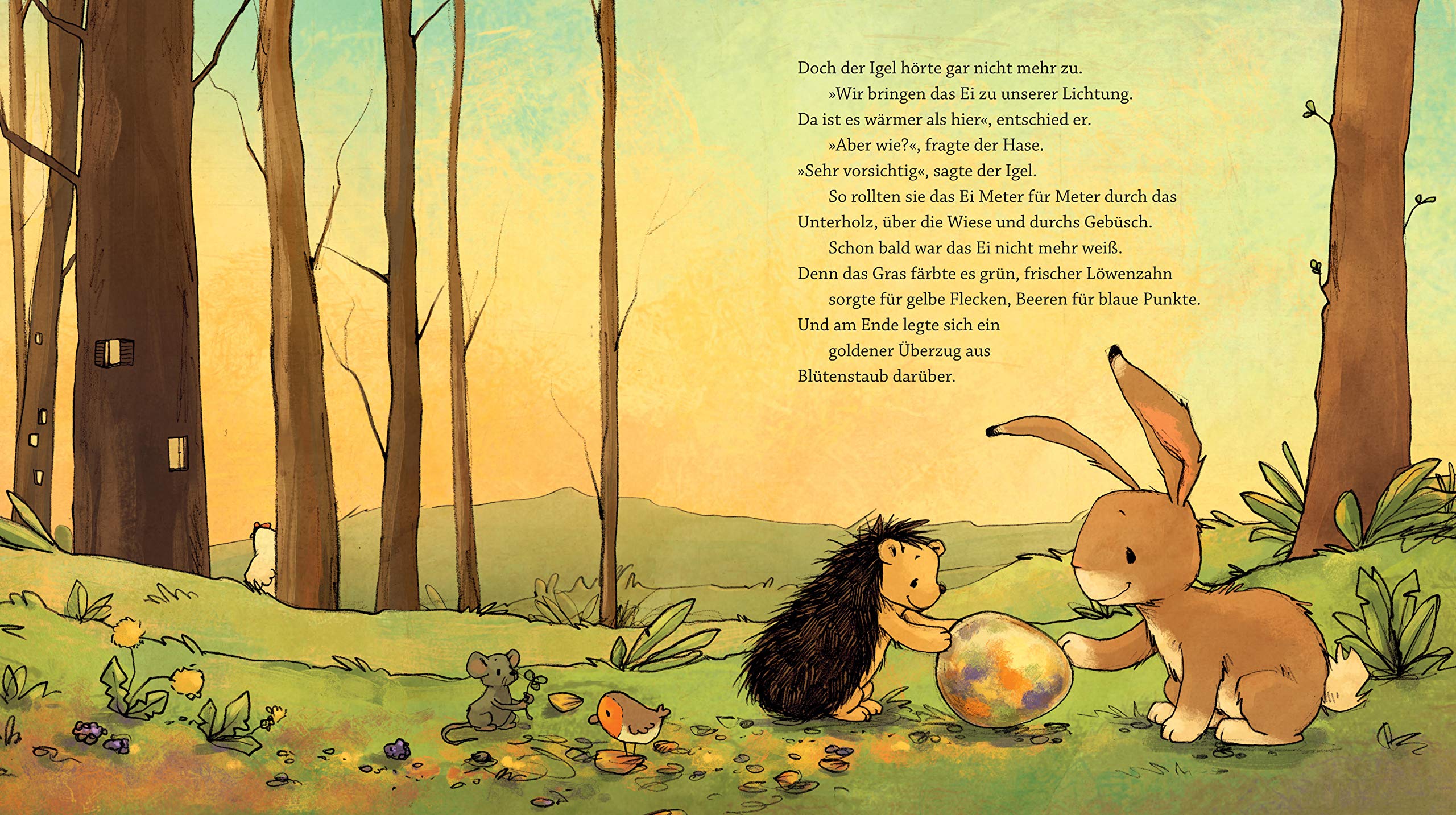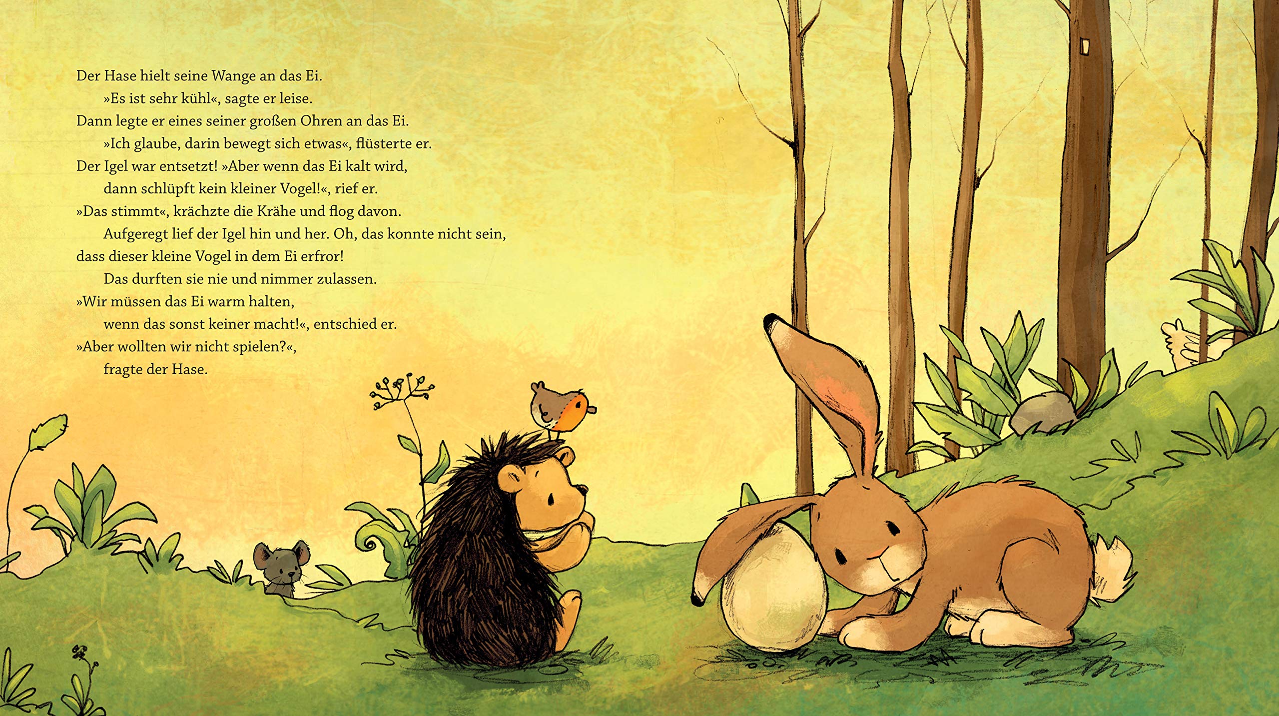 Etwas Weißes, Rundes, Glattes. Etwas, was die beiden noch nie gesehen haben. Ein Ei, das weiß zum Glück die Krähe in den Bäumen über ihnen. Und eines Tages schlüpft aus so einem Ei ein kleines Küken, jedoch nur, wenn es warmgehalten wird. Oh, ein kleiner Vogel, der darin wohnt. Zusammen rollen sie das Ei Meter für Meter durch das Unterholz, über die Wiese und durch das Gebüsch bis sie ihre Lichtung erreichen. In den folgenden Tagen und Nächten legen sich Hase und Igel abwechselnd auf das Ei und halten es warm. Und eines Morgens pocht etwas leise gegen die Schale…