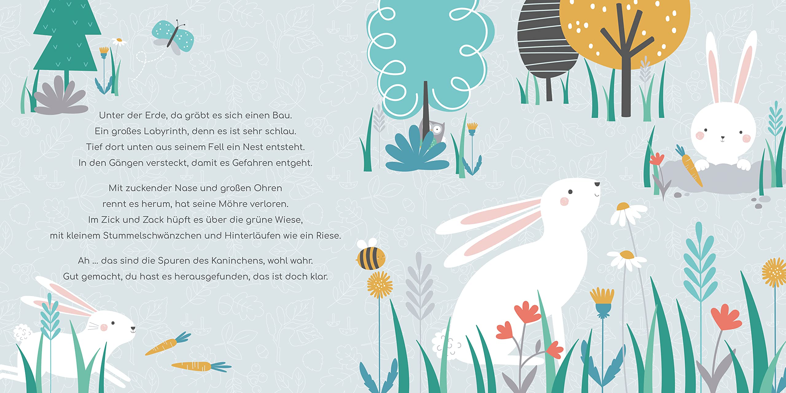 Wundersame Spuren im Wald - Kaninchen neben Text