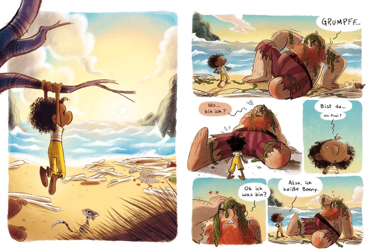 Sie klettert hoch zur Katze auf einen Baum. Knack! Bricht der Ast unter ihr ab. Bonny fällt, kann sich aber zum Glück an einem anderen Ast festhalten. Nanu, was sieht sie denn da? Am Strand liegt eine große, schlafende Gestalt. Ein Pirat? Das muss Bonny unbedingt herausfinden. Der Mann erinnert sich an nichts, nicht einmal an seinen Namen. Bonny ist sicher, dass er bei einem Sturm Schiffbruch erlitten hat. Sie nennt ihn ganz einfach „Zack“ und will ihm helfen, sein Schiff und seine Crew wiederzufinden. Und ehe es sich Zack versieht, stechen die beiden gemeinsam per Floß in See…
